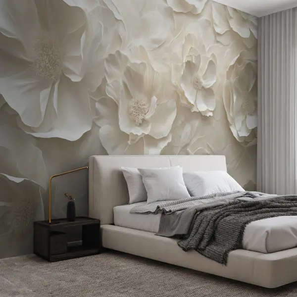 - 3D Rosen Fototapete – Tiefe und Struktur; passt zu plastischen Blüten und feinen Linien.