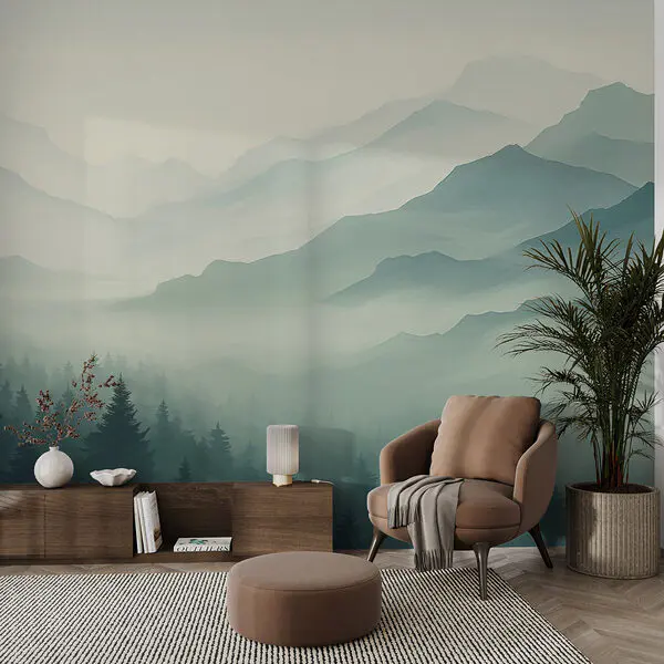 Fototapeten Neblige Landschaft mit Bäumen und Pflanzen