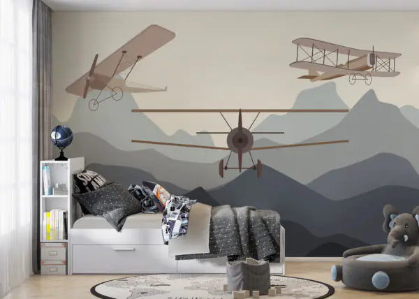 Fototapeten Neblige Landschaft mit Bäumen und Bergen