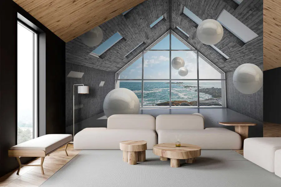 Verwandeln Sie Ihren Raum in einen traumhaften Zufluchtsort mit dieser Fototapete, die eine weiße Kugel zeigt, die in einem Betonraum schwebt. Es ist, als würde man eine Kunstinstallation betreten, ohne den Komfort des eigenen Zuhauses zu verlassen. Stellen Sie sich vor, wie Sie gedankenverloren an einem Kaffee nippen, während diese eleganten Kugeln um Sie herum zu tanzen scheinen. Die Mischung aus modernem, industriellem Look und dem faszinierenden Blick auf das Meer schafft eine entspannte Atmosphäre. Perfekt, um die Kreativität anzuregen oder einfach nur einen Moment durchzuatmen. Ob in einem gemütlichen Wohnzimmer oder einem schicken Büro, diese Fototapete lädt zu Neugier und Gesprächen ein und lässt jede Wand lebendig wirken. Fühlen Sie die Stimmung!