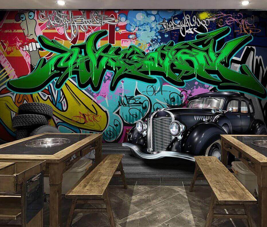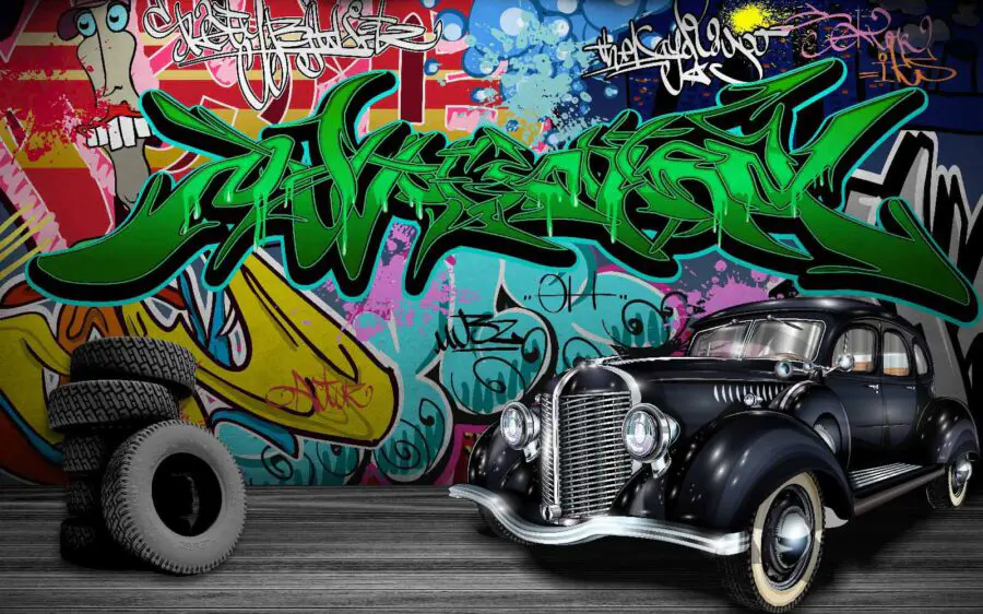 Verwandeln Sie eine langweilige Wand in einen lebendigen Gesprächsaufhänger mit diesem auffälligen Wandbild, das ein klassisches schwarzes Auto vor einem bunten Graffiti-Gewirr zeigt. Stellen Sie sich vor, Sie stehen in einem Raum, der vor Energie sprüht – jeder Blick bringt neue Details zum Vorschein! Der Kontrast zwischen dem eleganten Fahrzeug und dem lebhaften Hintergrund schafft eine perfekte Mischung aus Nostalgie und moderner Kunst.