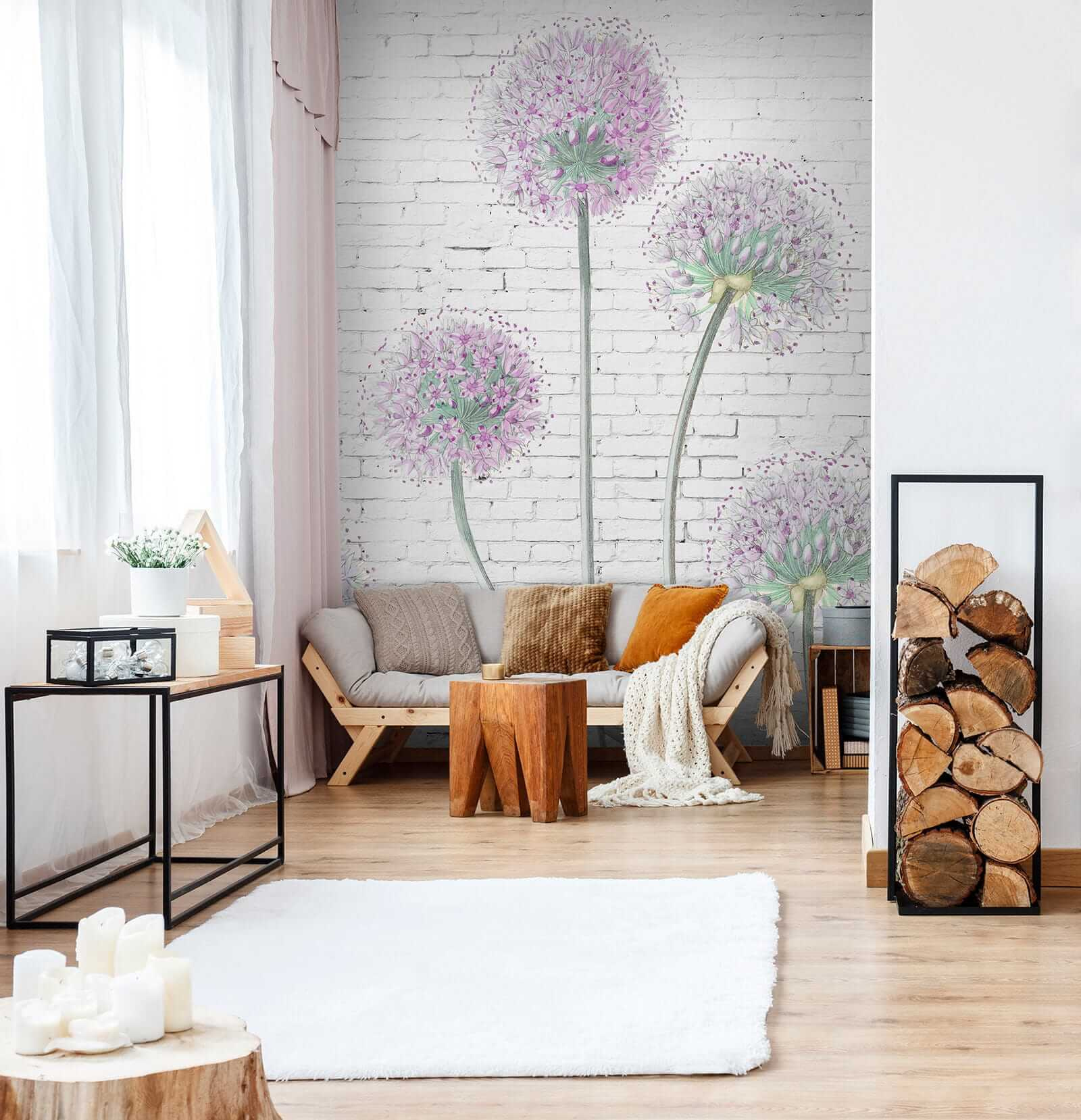 Fototapeten Blumenblüten vor weißem Backsteinhintergrund Fototapeten Blumenblüten vor weißem Backsteinhintergrund