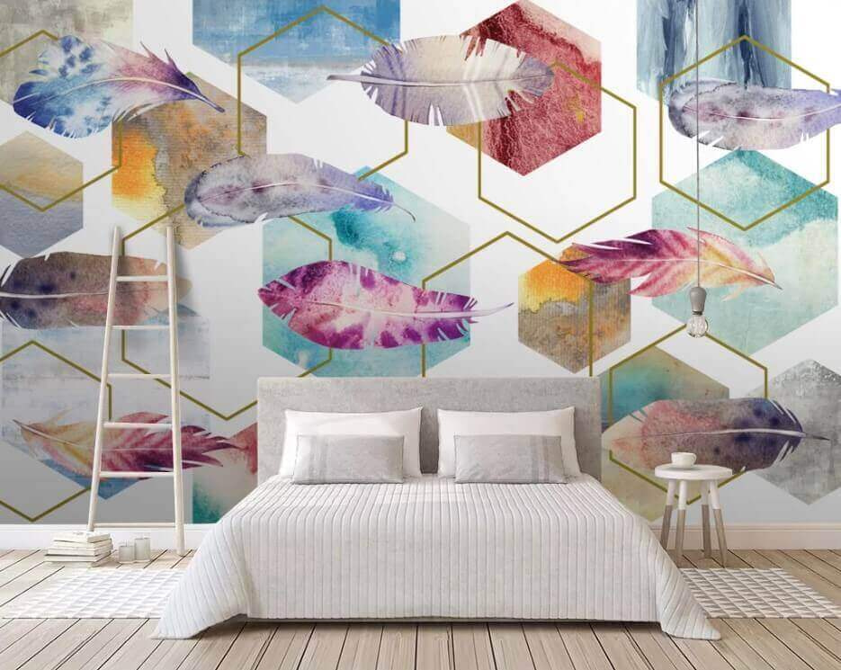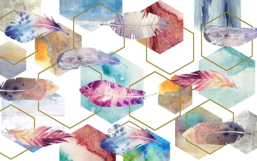 Verwandeln Sie eine schlichte Wand in einen lebendigen Gesprächsaufhänger mit „Colorful Feathers and Hexagons”. Dieses Wandbild sprüht vor sanften, aquarellartigen Federn, die über geometrische Formen tanzen und eine skurrile Mischung aus Natur und modernem Design schaffen. Stellen Sie sich vor, Sie betreten einen Raum und fühlen sich sofort beschwingt – wie ein Hauch frischer Luft in Ihrem eigenen gemütlichen Zuhause. Die sanften Farben und weichen Linien harmonieren wunderbar miteinander und bilden den perfekten Hintergrund zum Tagträumen, Lesen oder einfach nur zum Kaffeetrinken mit Freunden. Es ist, als hätten Sie ein Kunstwerk, das mit Ihrer Einrichtung kommuniziert. Wer hätte gedacht, dass eine Wand so lebendig wirken kann?