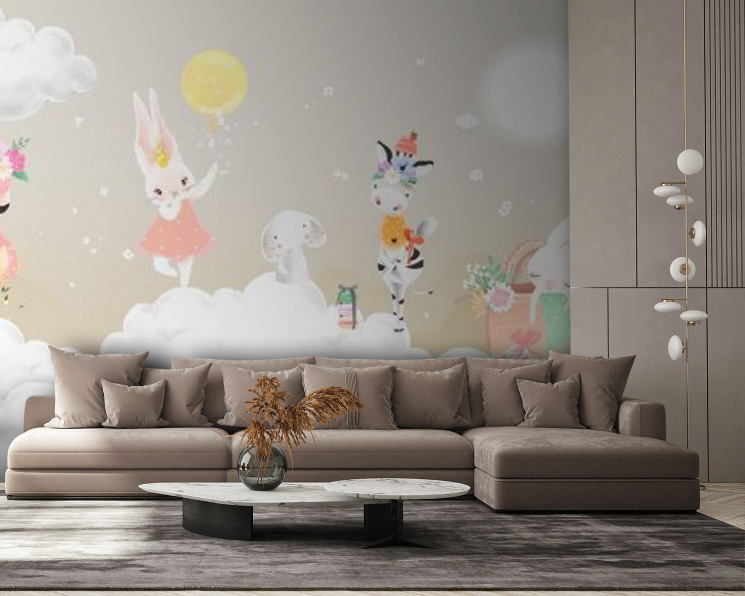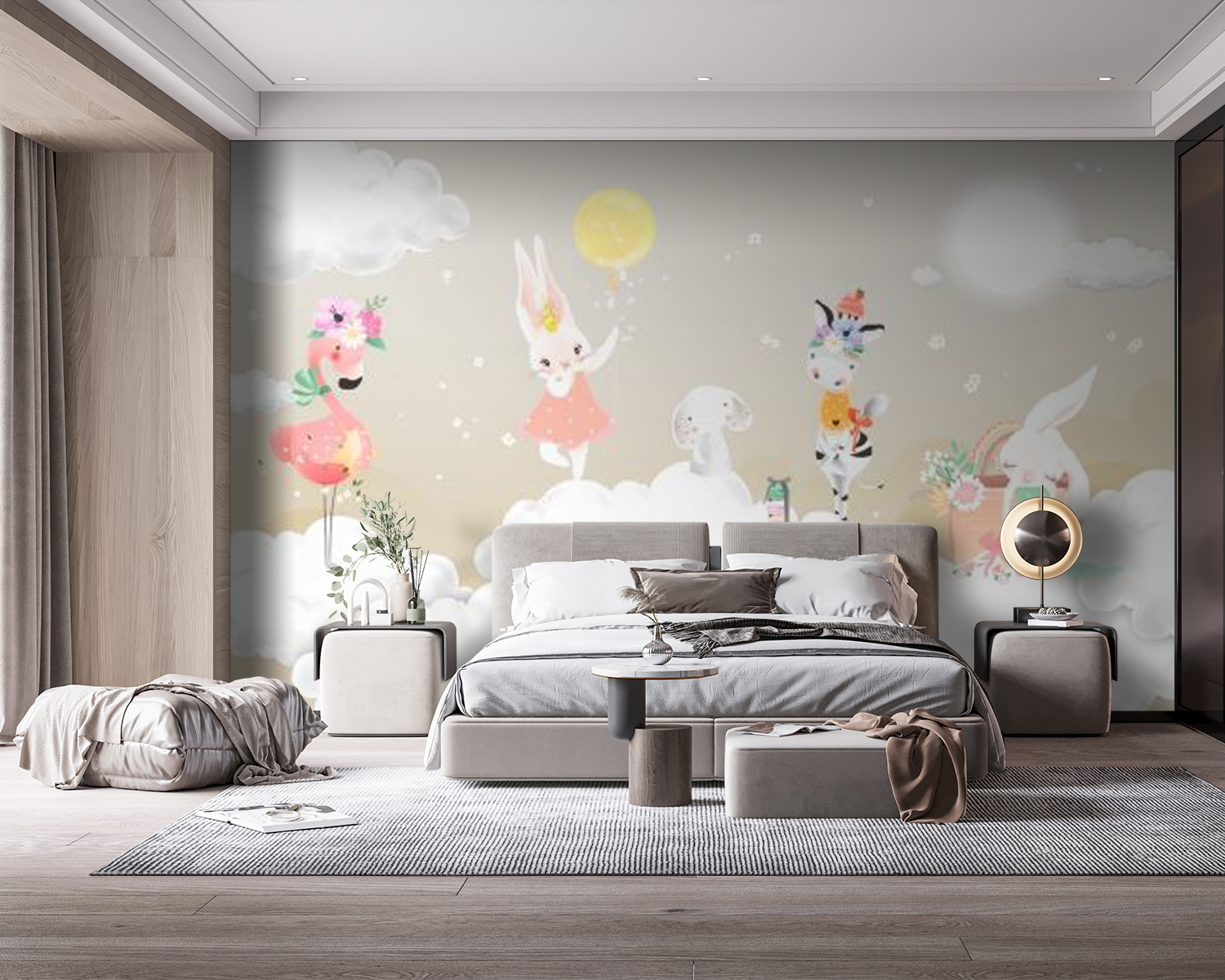 Verwandeln Sie eine triste Wand in ein verträumtes Paradies mit diesem bezaubernden Wandbild, das eine skurrile Gruppe von Tieren zeigt, die sich auf flauschigen Wolken tummeln. Stellen Sie sich vor: ein verspielter Flamingo, ein bezauberndes Häschen in einem rosigen Kleid und ein Zebra mit einem kleinen Hut, die sich im Himmel tummeln, als gehörte ihnen alles. Diese Fototapete strahlt eine warme, fröhliche Atmosphäre aus, die in jedem Raum Freude auslösen kann, vom lebhaften Kinderzimmer bis zur gemütlichen Leseecke. Es fühlt sich wie eine Umarmung für die Wände an und hüllt Räume in ein Gefühl von Wunder und Fantasie. Wer würde nicht jedes Mal lächeln, wenn er daran vorbeigeht? Perfekt für alle, die einzigartige Dekoration und einen Hauch von Magie lieben.