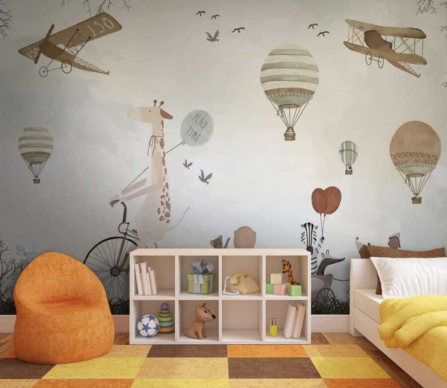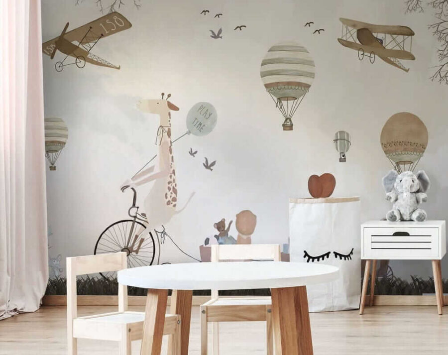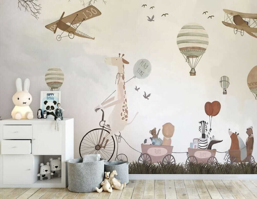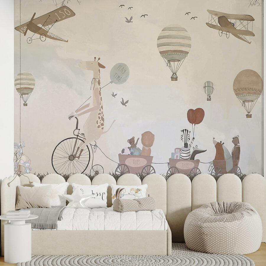 Verwandeln Sie das Zimmer Ihres Kindes in ein skurriles Abenteuer mit diesem charmanten Heißluftballon-Wandbild! Stellen Sie sich eine kichernde Giraffe auf einem Fahrrad vor, die mit entzückenden Tierfreunden “Spielzeit”-Stimmung verbreitet – es ist wie ein zum Leben erwachtes Märchenbuch.
