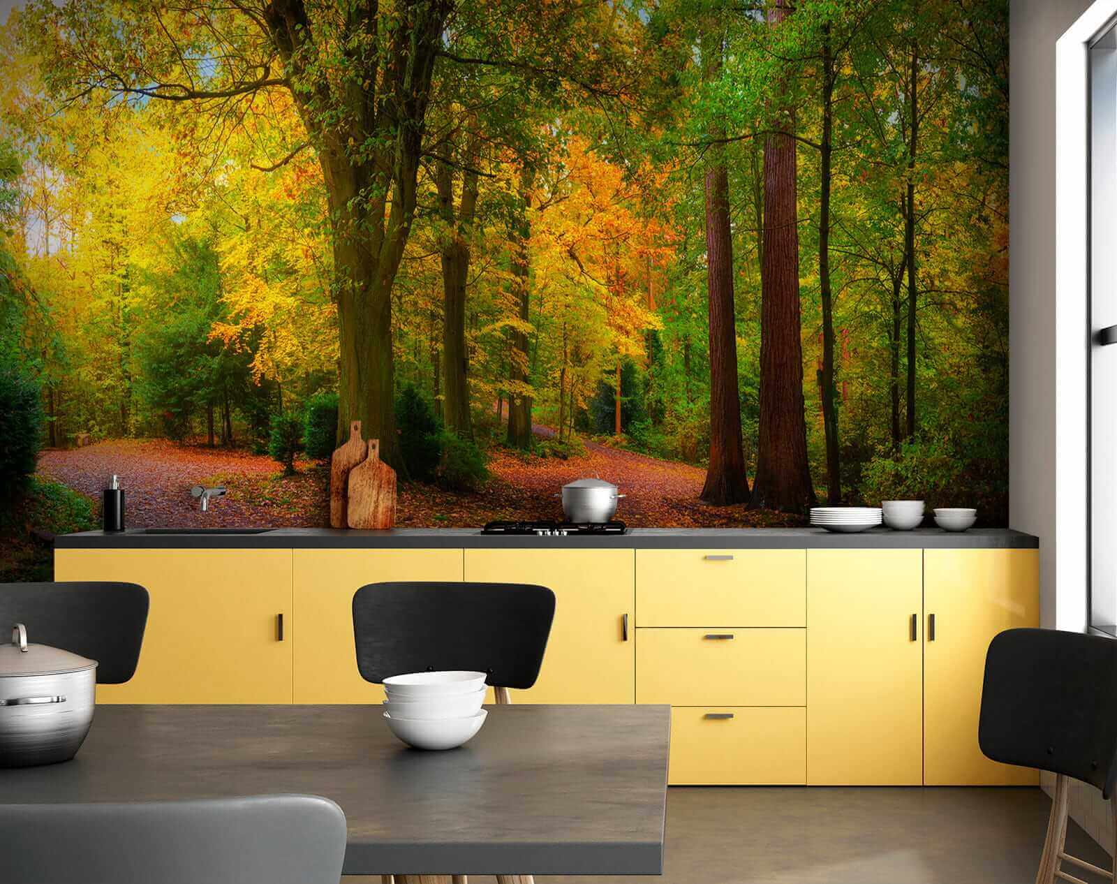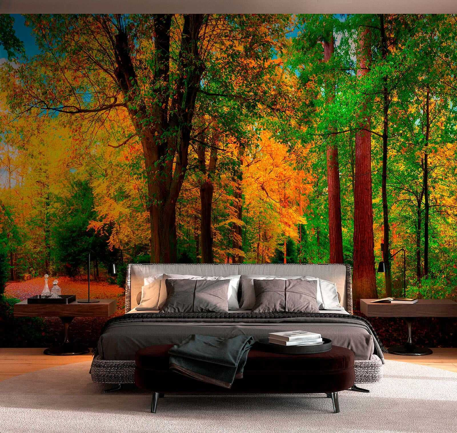 Verwandeln Sie jeden Raum mit dieser atemberaubenden Fototapete eines bunten Herbstwaldes. Stellen Sie sich verschlungene Pfade vor, die von lebhaften Bäumen umgeben sind, deren Blätter in satten Farbtönen gemalt sind, die die Essenz des Herbstes einfangen. Es ist, als ob man sich ein Stück Natur ins Haus holt, wo die sanfte Umarmung eines Waldspaziergangs im Hintergrund des alltäglichen Lebens brodeln kann. Stellen Sie sich vor, Sie schlürfen einen Kaffee, während Sie diese Szene betrachten, oder lassen Sie Ihre Gedanken auf diesen friedlichen Pfaden schweifen. Das Bild ist perfekt, um Wärme und Ruhe in Ihr Zuhause zu bringen, es regt zu Gesprächen an und bringt einen Hauch von Wildnis direkt an Ihre Wände. Naturliebhaber, freut euch!