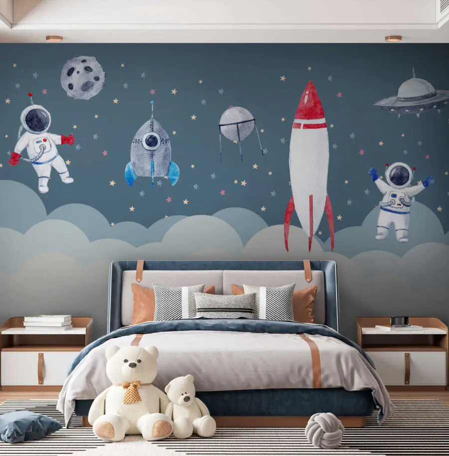 Stellen Sie sich vor: ein gemütlicher Abend, das Licht ist gedämpft, und Ihr Kind blickt auf dieses skurrile Aquarell-Astronauten-Wandbild. Es ist wie eine Geschichte aus einem verträumten Märchenbuch – lebhafte kleine Astronauten, die zwischen den Sternen schweben und die Schlafenszeit magisch machen… und vielleicht zu zukünftigen Weltraumabenteuern inspirieren! Dieses Wandbild ist nicht nur Kunst, es ist eine Eintrittskarte in eine andere Welt. Es passt perfekt in jedes Kinderzimmer und verbreitet eine verspielte und doch heitere Stimmung. Es ist voller Charme, mit seinen sanften Farbtönen und fröhlichen Figuren, die jede Wand in eine Leinwand der Fantasie verwandeln. Jedes Mal, wenn Sie es sehen, werden Sie sich ein Lächeln nicht verkneifen können!