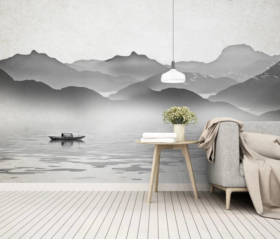 Imagine entering a room and being greeted by a serene scene of a boat gliding across calm waters, with majestic mountains rising in the background. This wall mural transports you to a tranquil escape, where worries seem to drift away like that boat on the glassy surface. The gentle monochrome palette evokes calmness, making it a perfect fit for a cozy reading nook or a relaxing bedroom.
