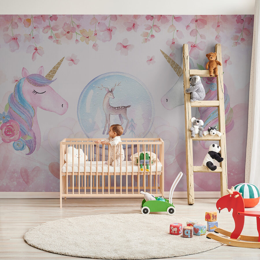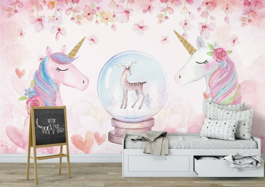 Mit seinen sanften Einhörnern inmitten von zartrosa Blumentönen und einem atemberaubenden Reh in einer Schneekugel wirkt dieses Wandbild wie aus einem Märchen. Die sanften Aquarelltöne wirken beruhigend, während die verspielten Details die Fantasie und Laune anregen.