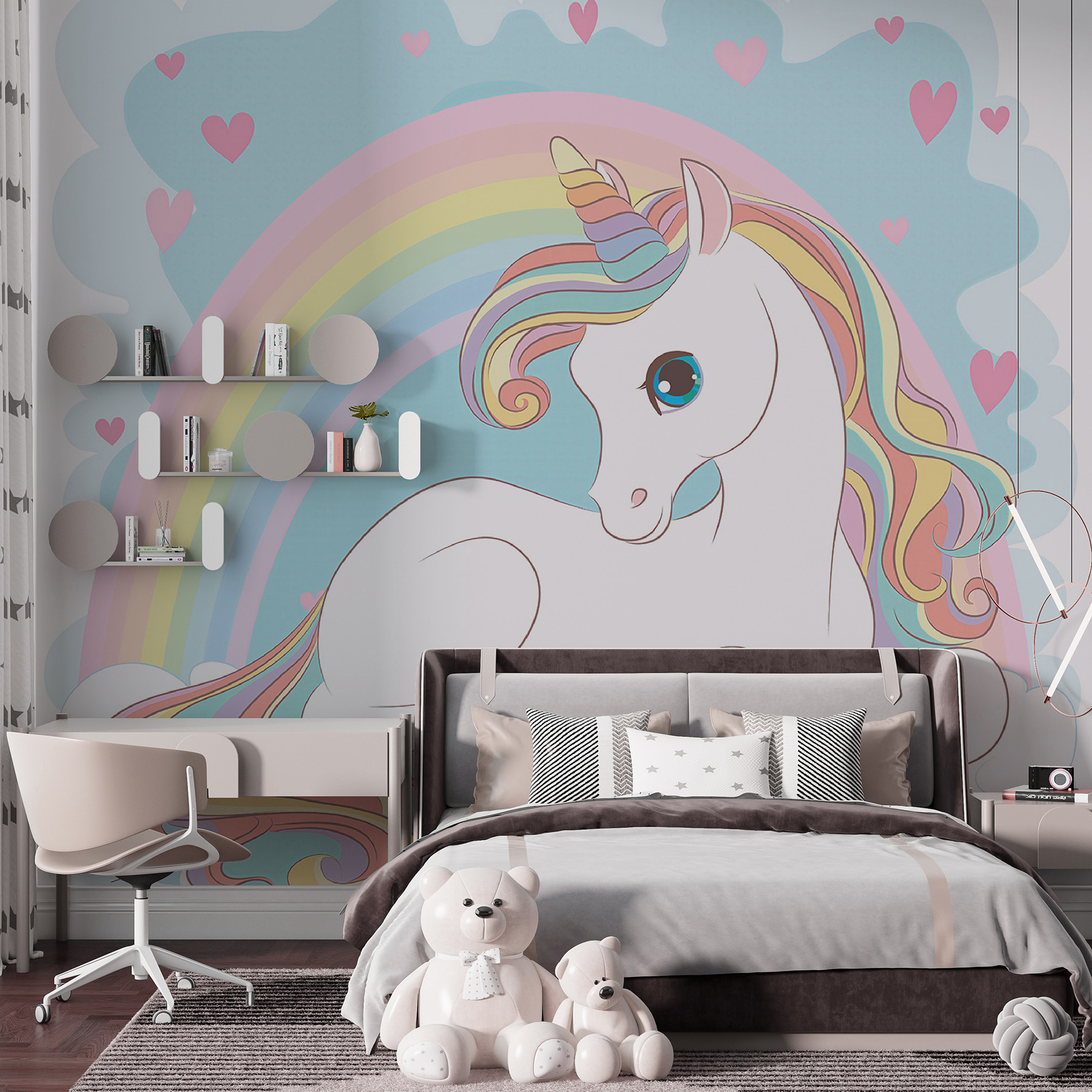 Stellen Sie sich vor, Sie wachen jeden Morgen in einem verträumten, magischen Land auf – ja, genau das ist es, was dieses “Wandbild Rosa Herz auf blauem Hintergrund” bewirkt! In süßen Pastelltönen gehalten, zeigt es ein entzückendes Einhorn auf flauschigen Wolken, um das herum Herzen schweben – absolut Pinterest-tauglich, nicht wahr? Perfekt, um dem Kinderzimmer einen Hauch von Laune zu verleihen, vor allem, wenn Einhörner bei Ihnen zu Hause ein Thema sind. Es ist, als würde man in ein Märchen eintauchen, das alle Arten von Freude und Kichern hervorruft. Pures Glück in einer Wandmalerei! Ideal, um einen spielerischen, beruhigenden Raum zu schaffen, in dem kleine Kinder ihrer Fantasie mit Regenbögen und Herzen freien Lauf lassen können. Bringen Sie also diesen Zauber an die Wand – lassen Sie Ihre Wände eine eigene Geschichte erzählen!