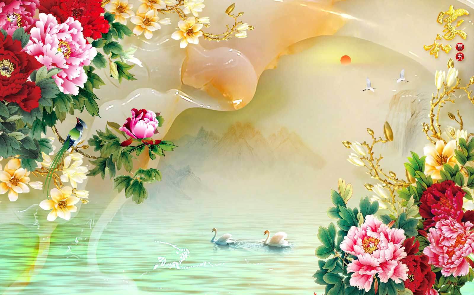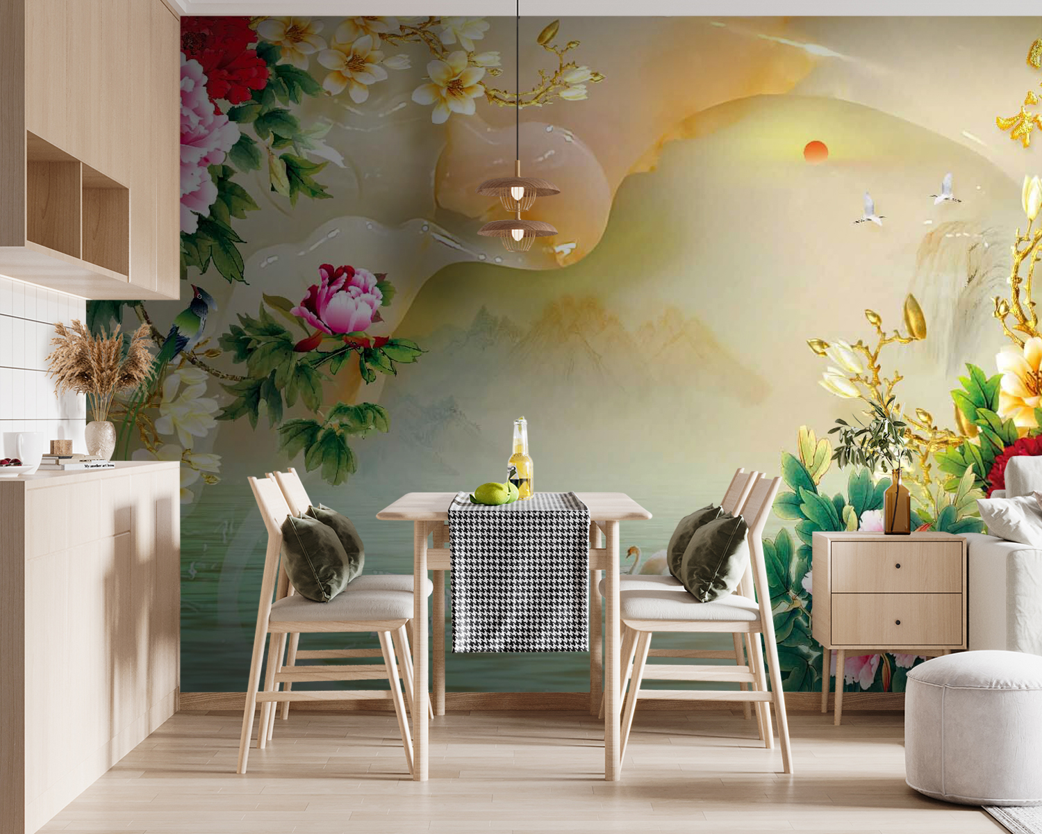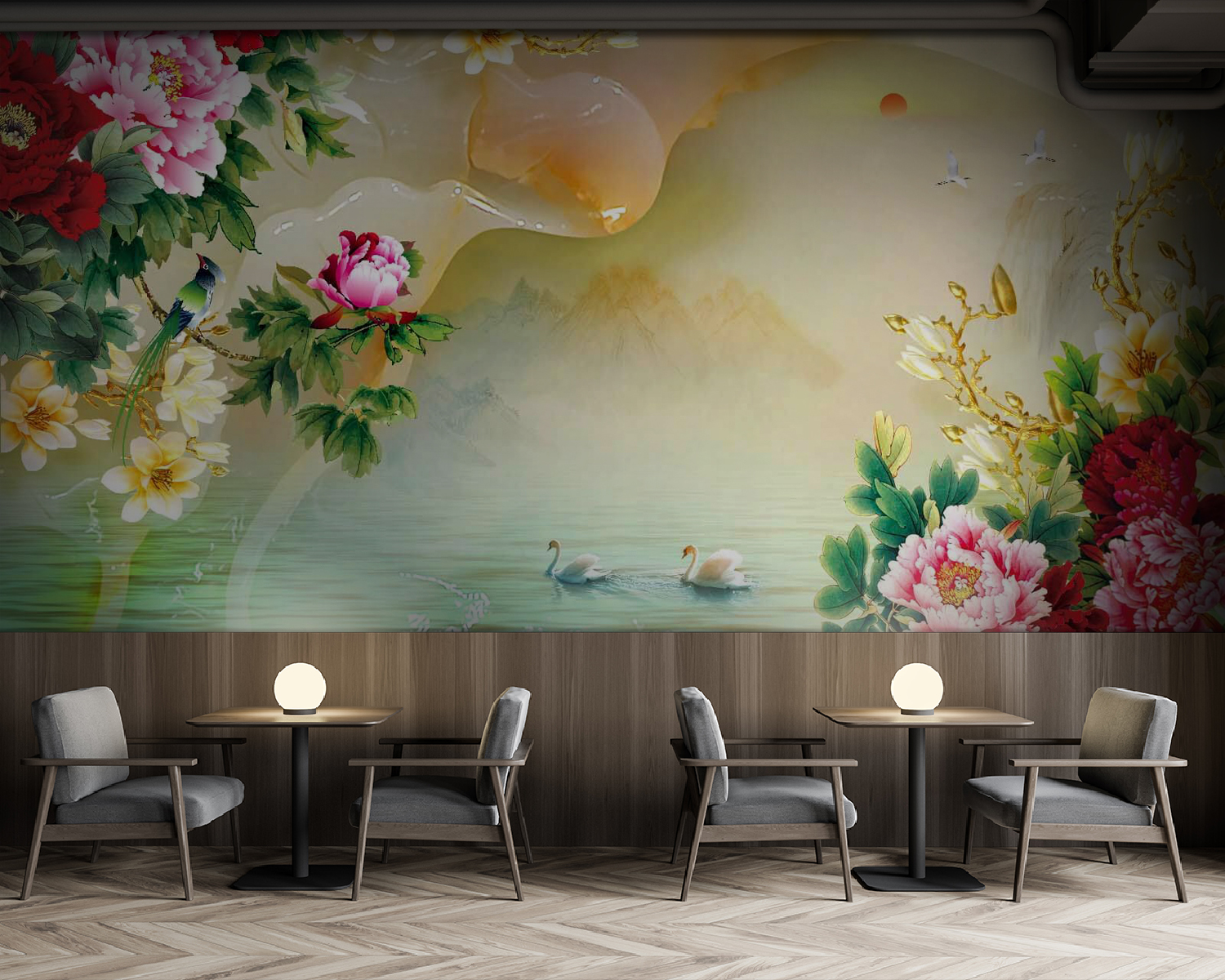 Verwandeln Sie jeden Raum in eine Oase der Ruhe mit dieser bezaubernden Wandtapete mit leuchtenden Blumen und anmutigen Schwänen. Die Pfingstrosen blühen in leuchtenden Farben und schaffen eine lebendige Atmosphäre, während die ruhigen Schwäne über eine traumhafte Wasseroberfläche gleiten und zu einem entspannten Nachmittagseinblick einladen. Stellen Sie sich vor, Sie trinken hier Tee und fühlen sich wie in einem Aquarellbild. Dieses Werk eignet sich perfekt für Akzentwände oder gemütliche Ecken und verbindet mühelos die Schönheit der Natur mit Ihrer Einrichtung. Es ist nicht nur Kunst, sondern eine Einladung, innezuhalten, durchzuatmen und das Leben ein wenig mehr zu genießen.