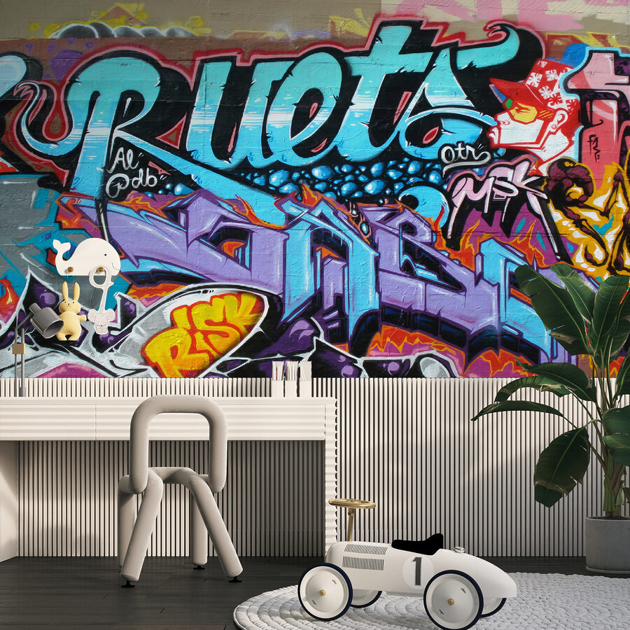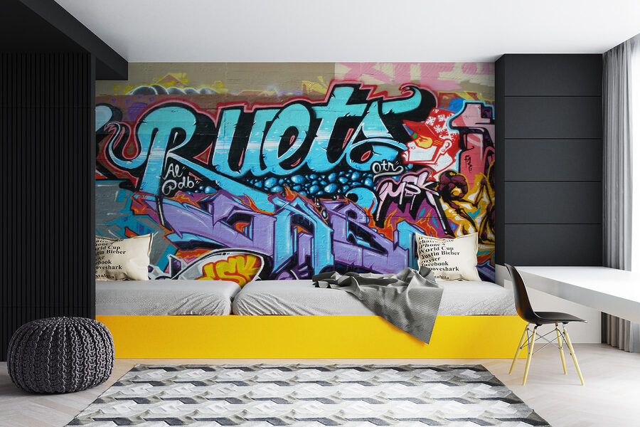 Dieses Wandbild ist perfekt für Teenager oder junge Erwachsene, die sich ein bisschen Großstadtflair in ihrem Raum wünschen, denn es strahlt Persönlichkeit aus – ohne ein Wort zu sagen. Es hat all diese leuchtenden Farben und komplizierten Designs, die einem das Gefühl geben, durch eine künstlerische Seitengasse in einer belebten Stadt zu schlendern.