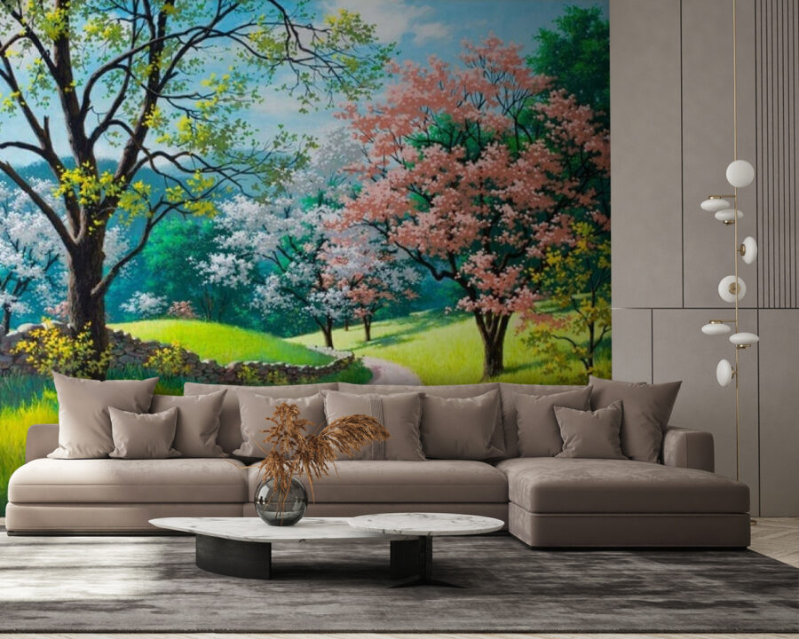 Stellen Sie sich vor, Sie betreten jedes Mal, wenn Sie Ihr Zimmer betreten, eine Oase der Ruhe. Diese Wandtapete „Dirt Road Through a Grassy Field with Trees“ fängt dieses Gefühl perfekt ein. Man kann fast das leise Rascheln der Blätter und das sanfte Zwitschern der Vögel in der Ferne hören. Mit leuchtendem Grün und verspielten rosa und weißen Blüten lädt es zu Tagträumen von gemütlichen Spaziergängen auf einem sonnenverwöhnten Weg ein. Es eignet sich perfekt für ein gemütliches Wohnzimmer oder ein ruhiges Schlafzimmer und bringt die Natur ins Haus – ganz ohne Gartenhandschuhe! Hängen Sie es auf, atmen Sie tief durch und verwandeln Sie Ihren Raum in einen Ort der Entspannung. Mal ehrlich, wer braucht schon Urlaub, wenn die eigenen Wände das Gleiche bewirken können?