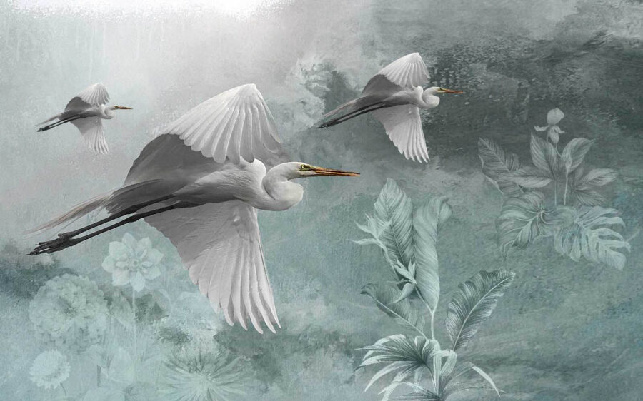 Transform your wall into a serene escape with this stunning mural featuring a graceful group of birds soaring through a tranquil sky. Imagine stepping into your room and feeling as if you’re outdoors, with these elegant creatures gliding above soft, dreamy hues. It’s like a breath of fresh air—perfect for brightening up spaces that need a little spark! Friends might just find themselves gazing at it, feeling a calm wash over them, while secretly wishing they could take a flight of fancy. It’s not just decor; it’s an experience inviting peace and inspiration right into your home.