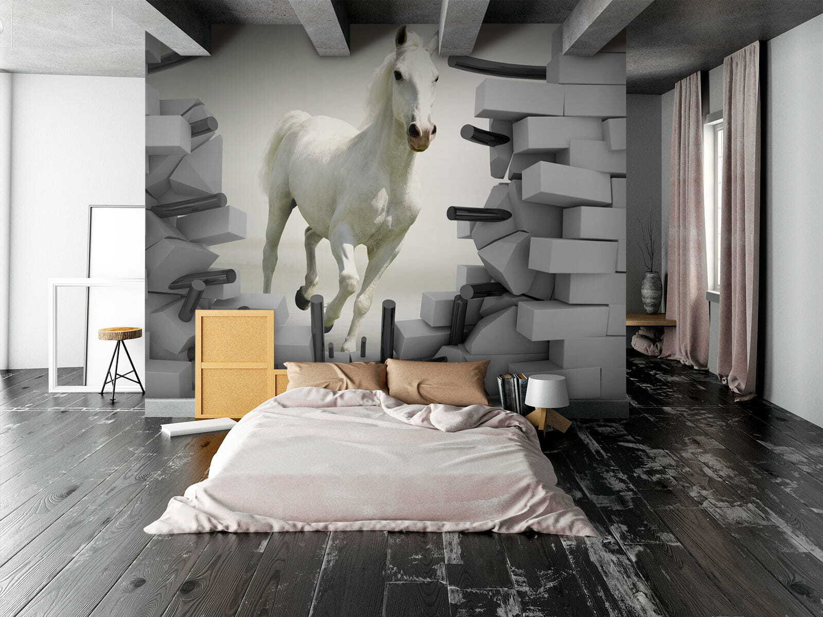 Stellen Sie sich vor, ein weißer Hengst galoppiert buchstäblich in Ihr Zimmer – direkt durch die Wand! Das ist es, was Sie mit dieser atemberaubenden Fototapete bekommen. Es hat diesen unglaublichen 3D-Effekt, der es so aussehen lässt, als würde das Pferd aus dem Kunstwerk heraus und direkt in Ihren Raum springen. Kinder werden vor Ehrfurcht erstarren und denken, sie seien Teil eines magischen Abenteuers. Und für Erwachsene ist es mit Sicherheit ein Gesprächsanlass! Ob für ein Spielzimmer, einen flippigen Wohnbereich oder sogar ein kreatives Büro, dieses Wandbild sorgt für einen Energieausbruch und einen Hauch von Laune. Es ist bezaubernd, frech und genau das richtige Maß an Unerwartetem – Sie können es einfach nicht ansehen, ohne zu lächeln!