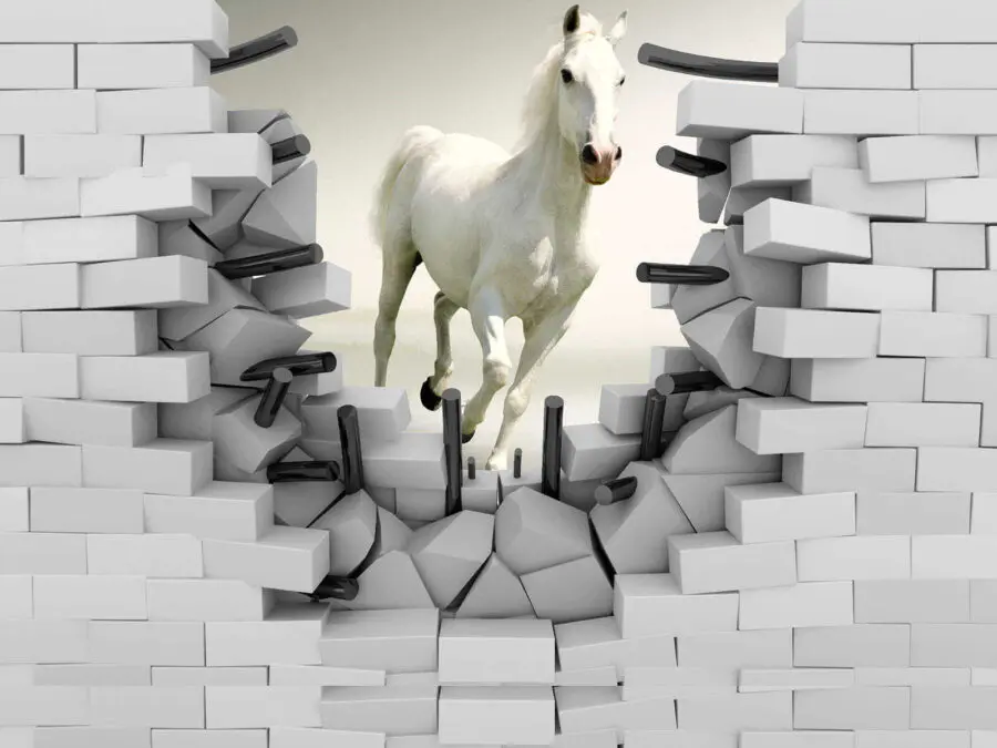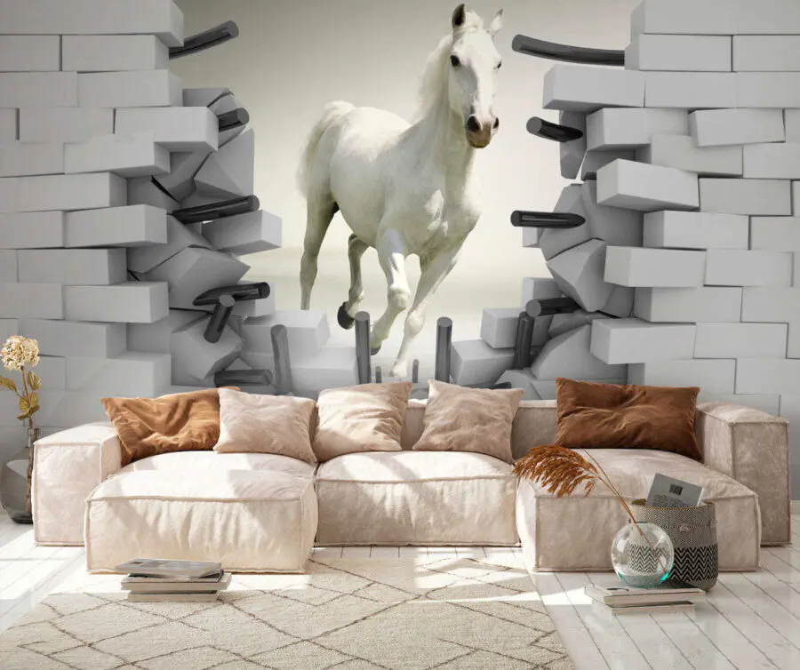 Stellen Sie sich vor, ein weißer Hengst galoppiert buchstäblich in Ihr Zimmer – direkt durch die Wand! Das ist es, was Sie mit dieser atemberaubenden Fototapete bekommen. Es hat diesen unglaublichen 3D-Effekt, der es so aussehen lässt, als würde das Pferd aus dem Kunstwerk heraus und direkt in Ihren Raum springen. Kinder werden vor Ehrfurcht erstarren und denken, sie seien Teil eines magischen Abenteuers. Und für Erwachsene ist es mit Sicherheit ein Gesprächsanlass! Ob für ein Spielzimmer, einen flippigen Wohnbereich oder sogar ein kreatives Büro, dieses Wandbild sorgt für einen Energieausbruch und einen Hauch von Laune. Es ist bezaubernd, frech und genau das richtige Maß an Unerwartetem – Sie können es einfach nicht ansehen, ohne zu lächeln!