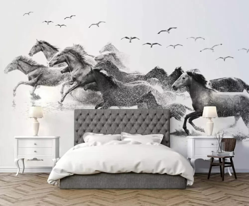 Werfen Sie einen Blick auf diese atemberaubende Fototapete – stellen Sie sich eine Gruppe majestätischer Pferde vor, die in atemberaubendem Schwarz-Weiß durch das Wasser spritzen. Es ist, als hätte man ein Stück der rohen Energie der Natur direkt an der Wand. Perfekt für jeden Raum, der einen Hauch von Dynamik braucht; diese galoppierenden Schönheiten sind voller Leben und Bewegung und lassen jeden Raum lebendiger und lebendiger wirken.