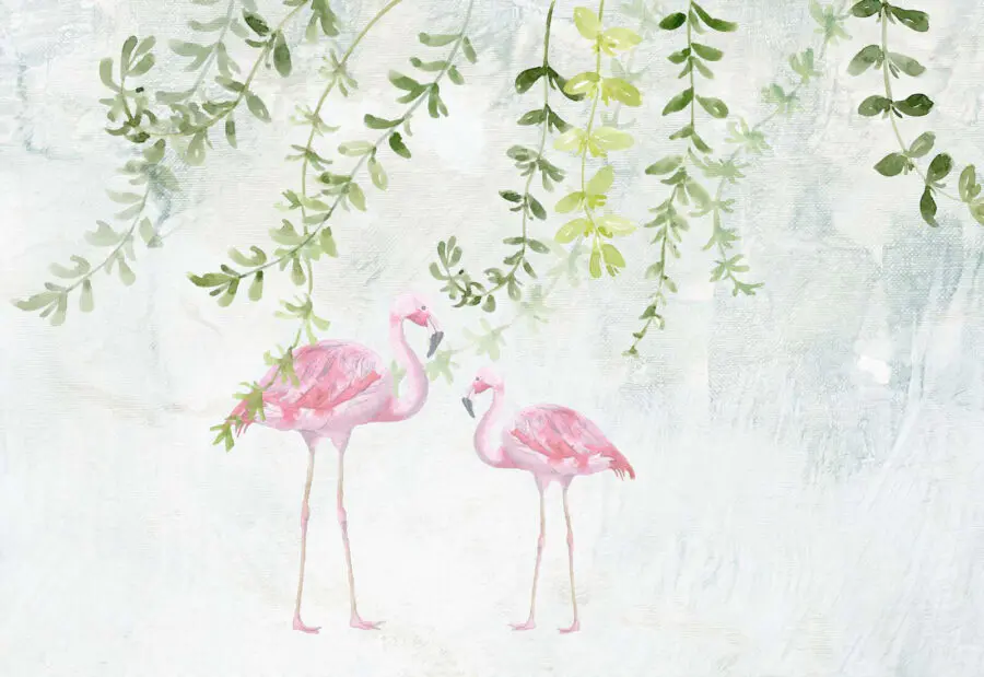 Stellen Sie sich vor, Sie betreten einen Raum und werden von diesem verträumten Wandbild mit zwei Flamingos begrüßt, die sich unter grünen Zweigen entspannen. Es hat diese entspannte, aquarellartige Ausstrahlung, die sowohl elegant als auch ein wenig verspielt ist. Perfekt für Vogelliebhaber oder alle, die sich einen Spritzer Farbe und Spaß in ihrem Raum wünschen. Stellen Sie sich vor, Sie trinken Ihren Morgenkaffee, und diese Flamingos stehen direkt daneben und sorgen für eine heitere, fast tropische Stimmung. Es ist, als ob man ein Kunstwerk und ein Stück Natur ins Haus holt. Auf jeden Fall ein Gesprächsanlass, wenn Freunde zu Besuch kommen!
