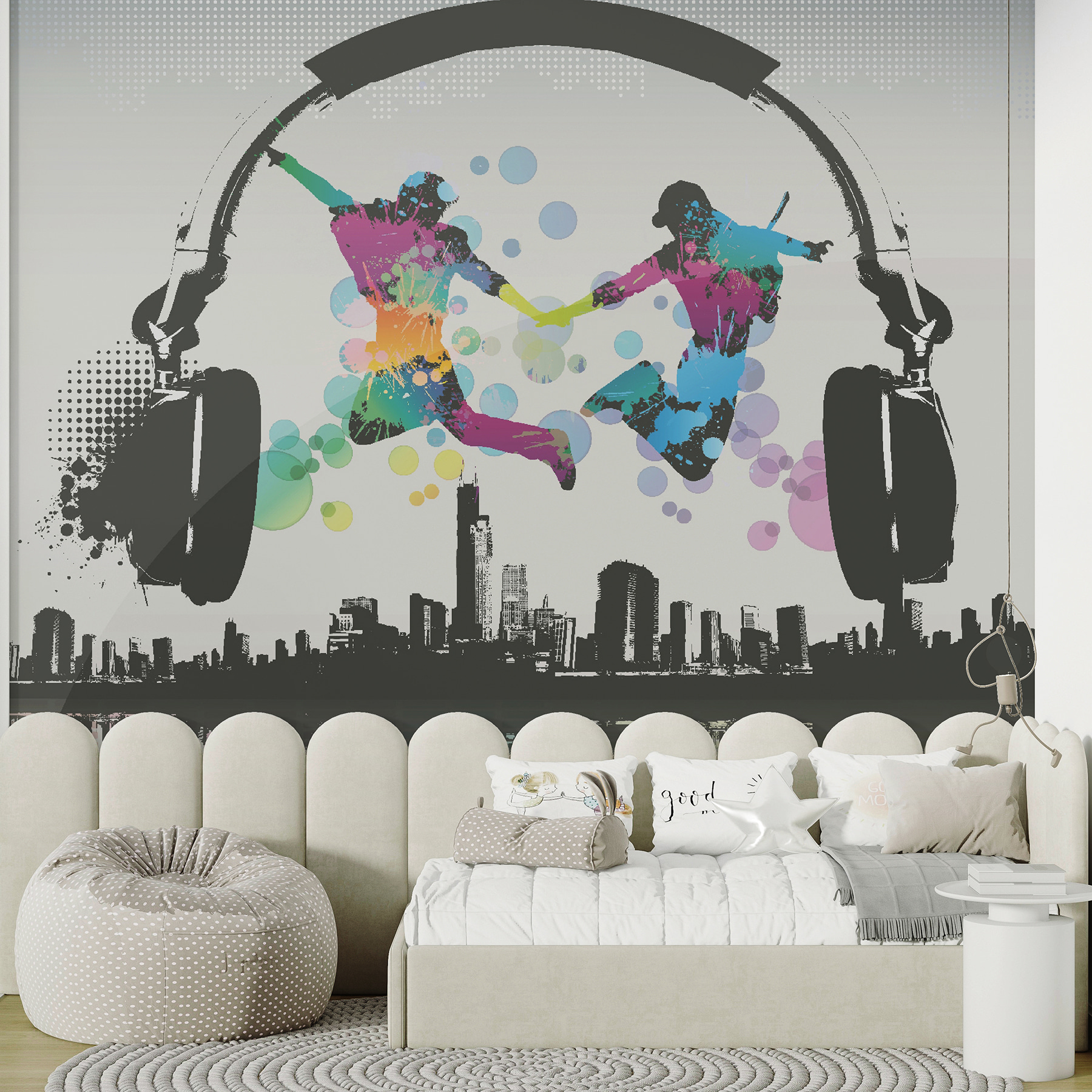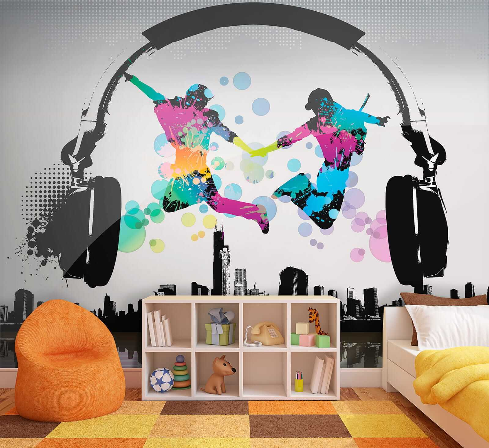 Das Motiv zeigt zwei Figuren, die vor einem Hintergrund aus Stadtlandschaft und riesigen Kopfhörern ausgelassen herumhüpfen – als würden sie zu ihrem eigenen Rhythmus tanzen und jeden, der sie sieht, zum Mitmachen einladen. Die kräftigen Farbspritzer fallen sofort ins Auge und sorgen für gute Laune! Außerdem ist es in Kategorien wie “Designertapete für die Wand” und “Beliebte Wandbilder” zu finden, so dass Sie wissen, dass Sie etwas Besonderes gefunden haben.