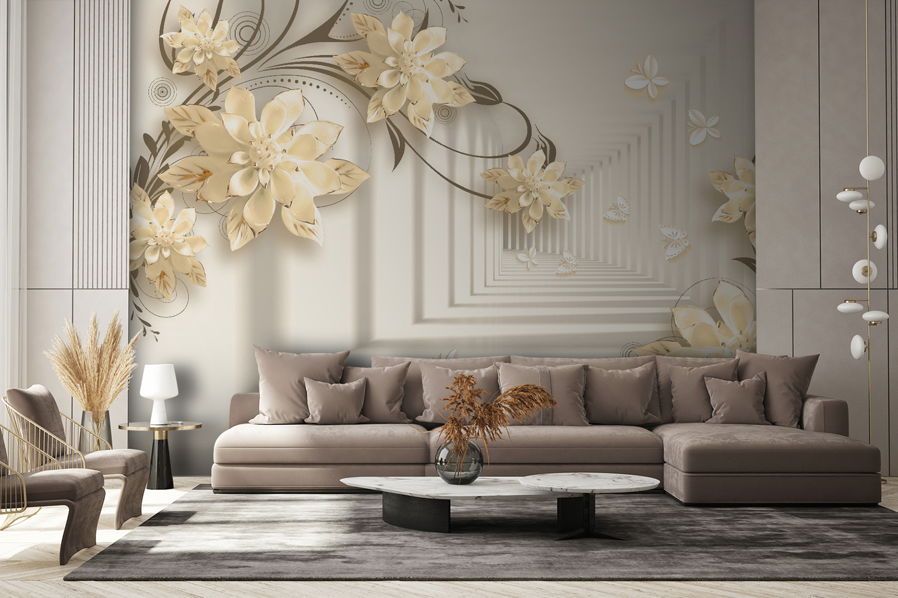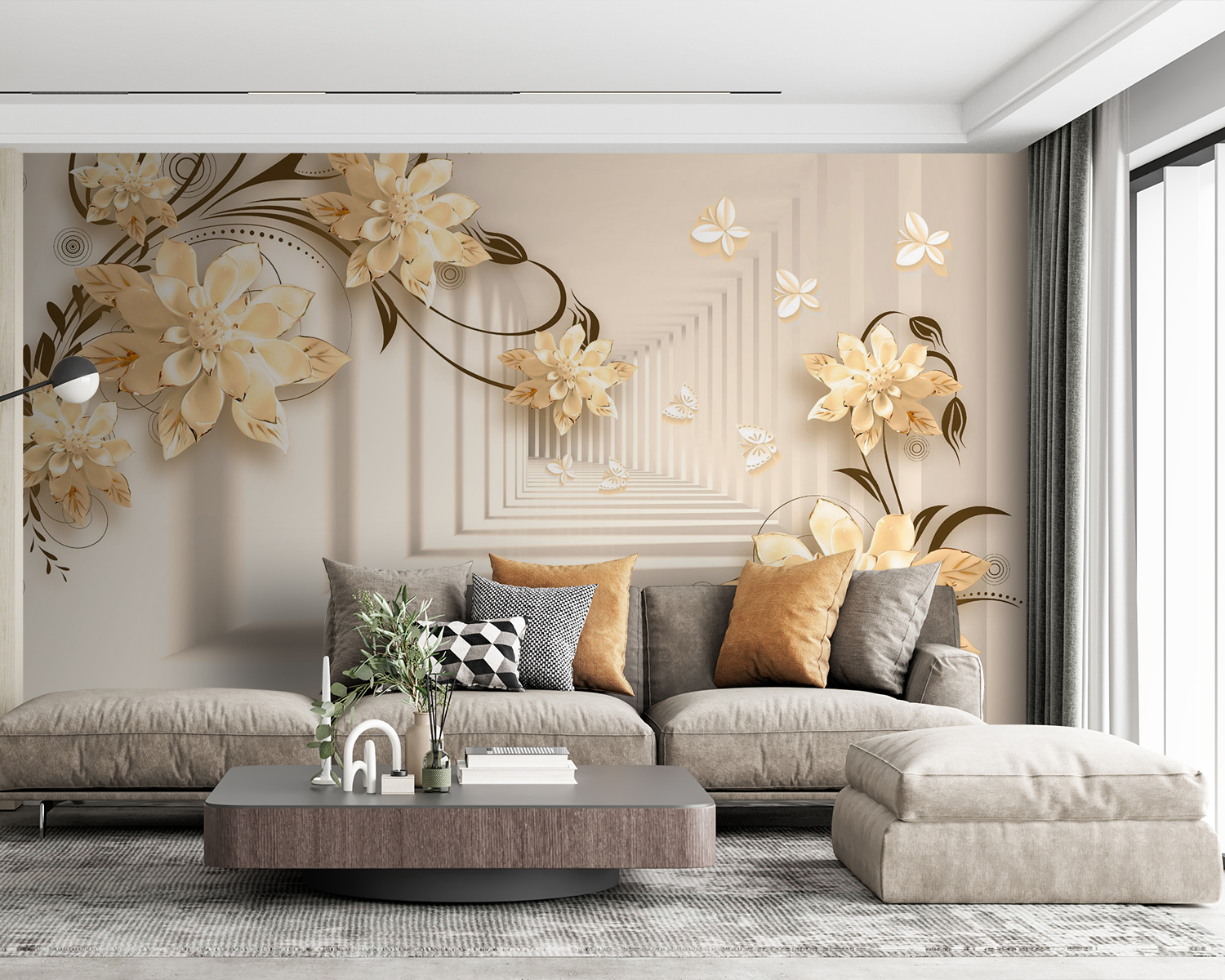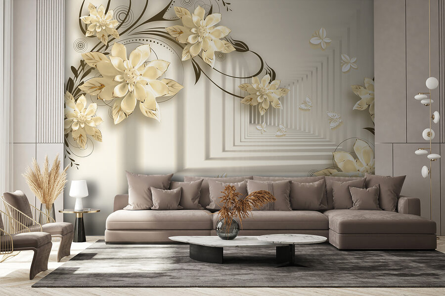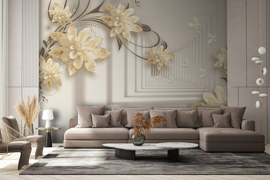Stellen Sie sich vor, Sie hätten eine Wand in Ihrem Wohnzimmer, die wie ein wunderlicher Garten aussieht! Dieses Wandbild “Elegantes Blumendesign mit Schmetterlingen” macht genau das. Es ist, als würden Sie in eine heitere Fantasiewelt eintauchen, in der Blumen ohne Ende blühen und Schmetterlinge vorbeiflattern. Stellen Sie sich diese eleganten 3D-Blüten vor, die eine sanfte, verträumte Stimmung erzeugen… Es ist, als ob Sie die Kunst der Natur direkt in Ihrem Wohnzimmer hätten!