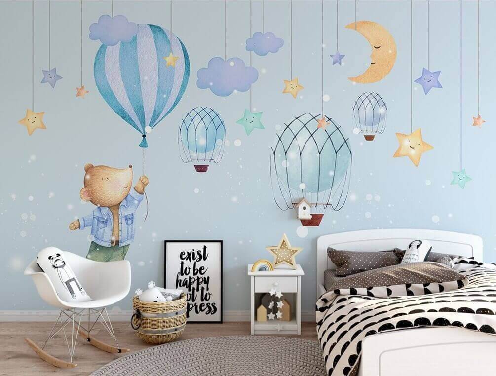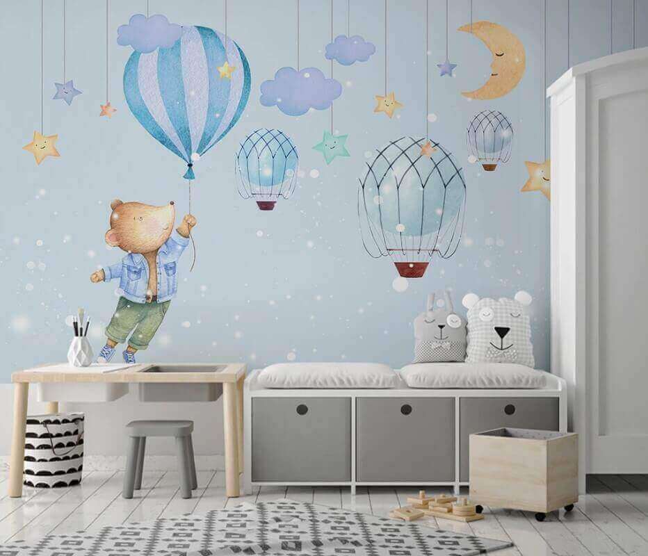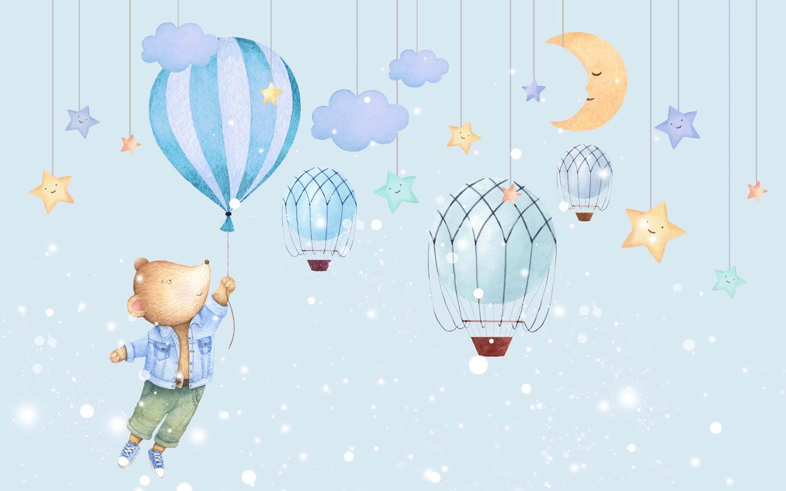 Verwandeln Sie jeden Raum in ein fantasievolles Wunderland mit dieser entzückenden Wandtapete, auf der ein charmanter Cartoon-Bär fröhlich einen Ballon festhält. Stellen Sie sich vor: Ein kleines Kind blickt voller Ehrfurcht zu dem Bären hinauf, der über einem traumhaften Himmel voller lächelnder Sterne und niedlicher Heißluftballons schwebt. Diese Wanddekoration regt die Fantasie an und lädt zum Abenteuer ein – und sorgt gleichzeitig für Farbe und gute Laune. Ideal für Kinderzimmer, Spielzimmer oder jede andere gemütliche Ecke, die ein bisschen Freude gebrauchen könnte. Können Sie sich vorstellen, wie es wäre, unter dieser Wandtapete Geschichten vorzulesen? Es ist wie eine warme Umarmung für die Wände! Warum lassen Sie sich also nicht von diesem Bären auf eine kleine Reise mitnehmen?