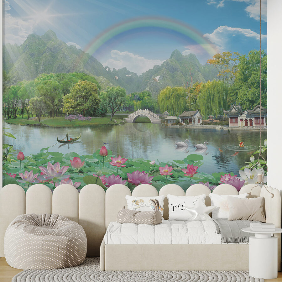 Stellen Sie sich vor, Sie betreten einen Raum und werden in ein ruhiges Paradies am See versetzt… Können Sie es fühlen? Genau das tut diese Fototapete. “Serene landscape with lotus flowers” ist wie ein sanfter Seufzer für die Seele – beruhigend und friedlich. Perfekt für Kinderzimmer oder jeden Raum, der einen friedlichen Touch braucht. Stellen Sie sich vor, Sie entspannen sich nach einem hektischen Tag, genießen das sanfte Licht der untergehenden Sonne, die Luft ist erfüllt vom süßen Duft der Lotosblumen… Sie werden sich jeden Tag wie im Urlaub fühlen! Außerdem ist es ein schöner Gesprächsanlass für Gäste (oder eine perfekte Instagram-Kulisse). Ganz gleich, ob Sie ein Babyzimmer dekorieren oder einen Hauch von Natur in Ihren Wohnraum bringen, dieses Wandbild wird Sie jedes Mal zum Lächeln bringen, wenn Sie es sehen.