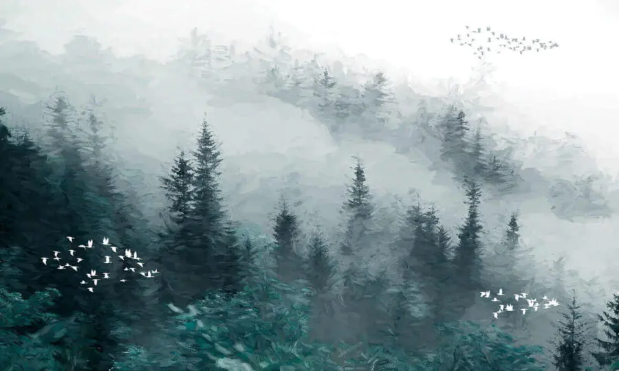 Fototapeten Nebliger Wald mit fliegenden Vögeln Fototapeten Nebliger Wald mit fliegenden Vögeln