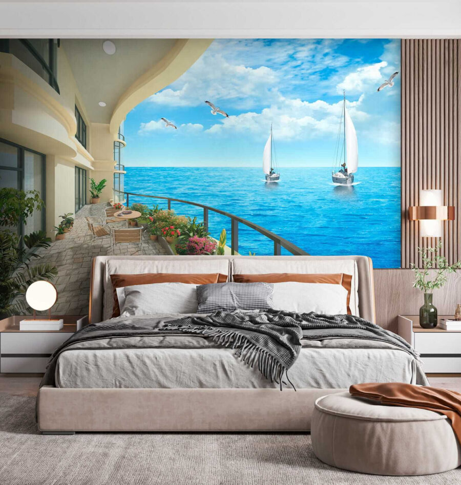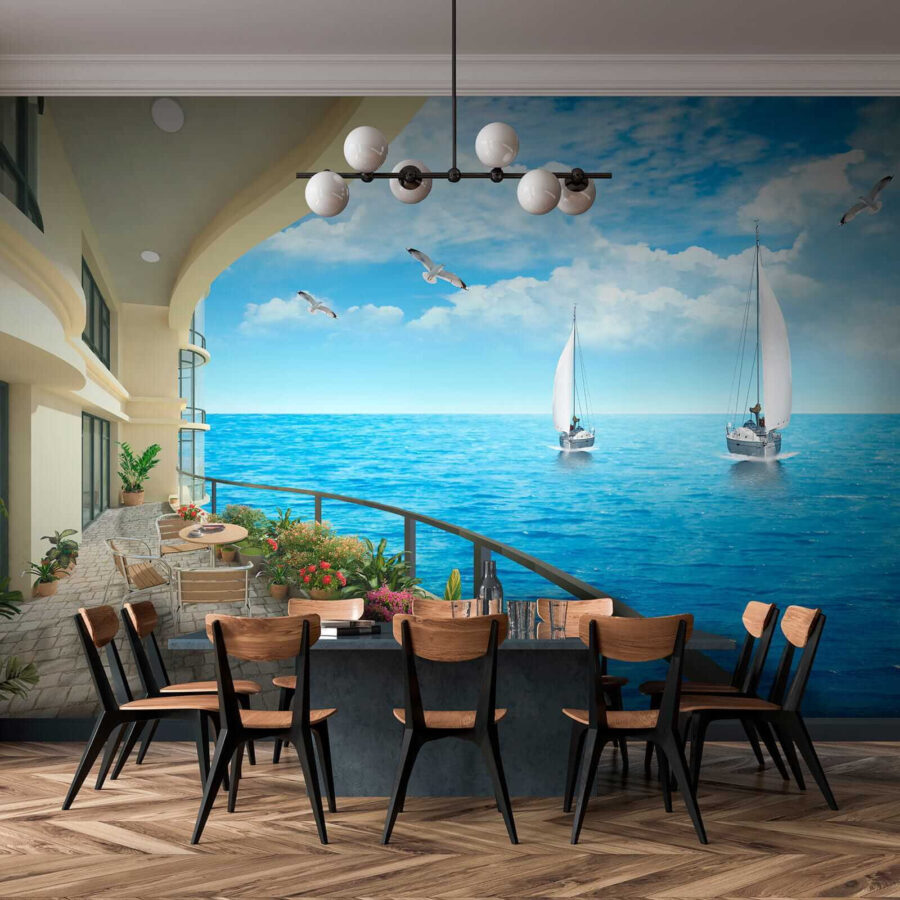 Stellen Sie sich vor, Sie betreten einen Raum, in dem die Wände die Meeresbrise direkt zu Ihren Sinnen bringen. Diese Fototapete, die einen Balkon mit atemberaubendem Blick auf den Ozean und Boote zeigt, die träge über das Wasser gleiten, verwandelt jeden Raum in einen Rückzugsort am Meer. Stellen Sie sich vor, Sie schlürfen Ihren Morgenkaffee mit der Symphonie von sanften Wellen und Seevögeln in der Luft – wer würde sich das nicht wünschen? Die leuchtenden Blautöne und das üppige Grün laden einfach zum Entspannen ein. Es ist wie ein endloser Urlaub zu Hause, der den Wänden einen Hauch von frischer Meeresluft verleiht. Perfekt für Tagträumer oder alle, die etwas Ruhe in ihrem Leben brauchen. Hängen Sie es einfach auf und lassen Sie die Wellen anrollen!