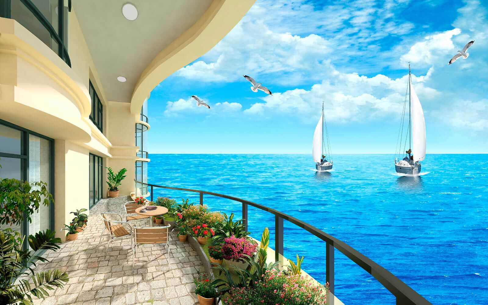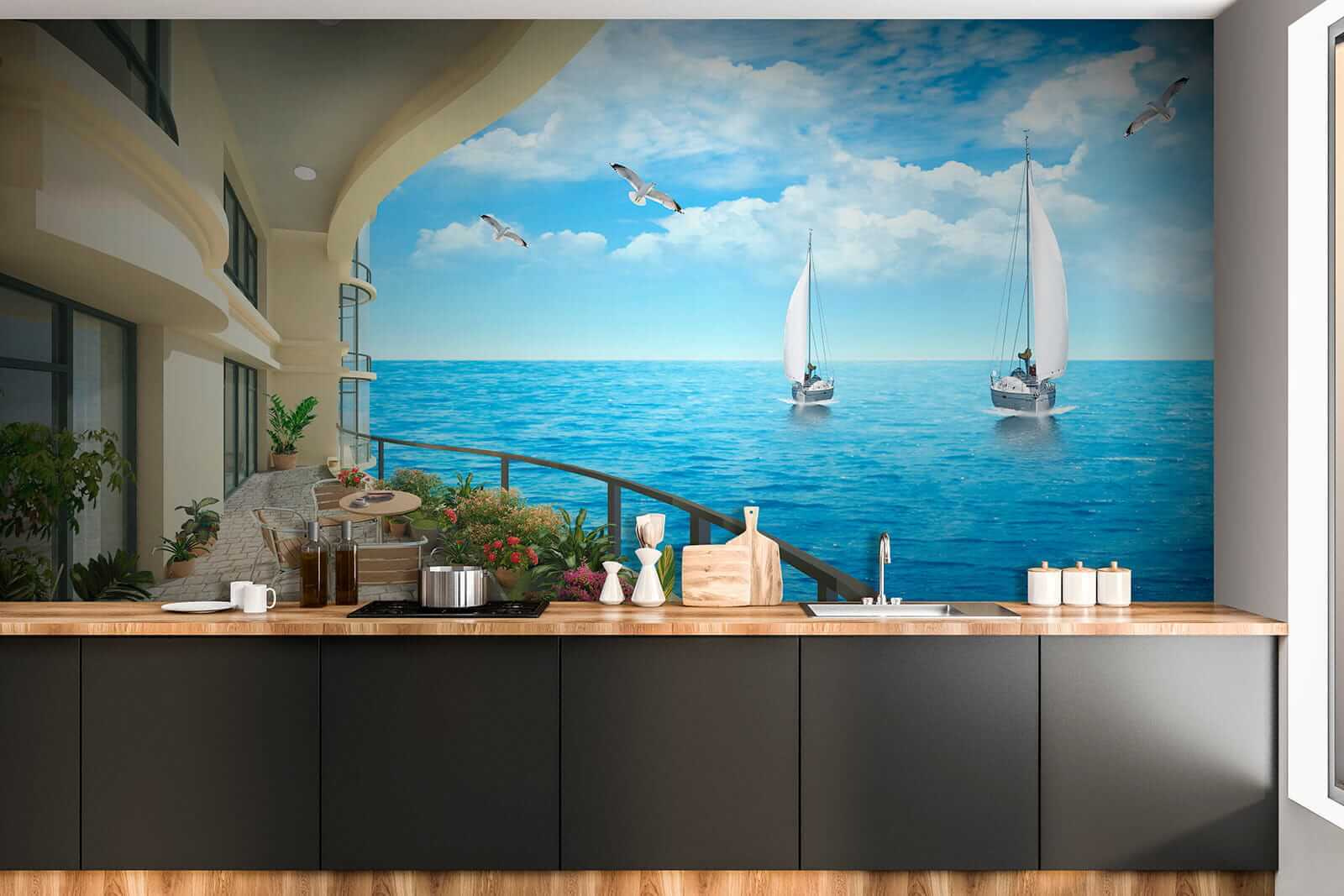 Stellen Sie sich vor, Sie betreten einen Raum, in dem die Wände die Meeresbrise direkt zu Ihren Sinnen bringen. Diese Fototapete, die einen Balkon mit atemberaubendem Blick auf den Ozean und Boote zeigt, die träge über das Wasser gleiten, verwandelt jeden Raum in einen Rückzugsort am Meer. Stellen Sie sich vor, Sie schlürfen Ihren Morgenkaffee mit der Symphonie von sanften Wellen und Seevögeln in der Luft – wer würde sich das nicht wünschen? Die leuchtenden Blautöne und das üppige Grün laden einfach zum Entspannen ein. Es ist wie ein endloser Urlaub zu Hause, der den Wänden einen Hauch von frischer Meeresluft verleiht. Perfekt für Tagträumer oder alle, die etwas Ruhe in ihrem Leben brauchen. Hängen Sie es einfach auf und lassen Sie die Wellen anrollen!