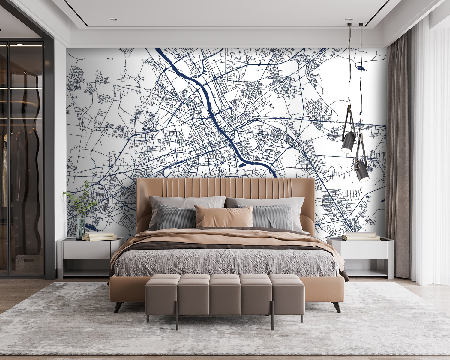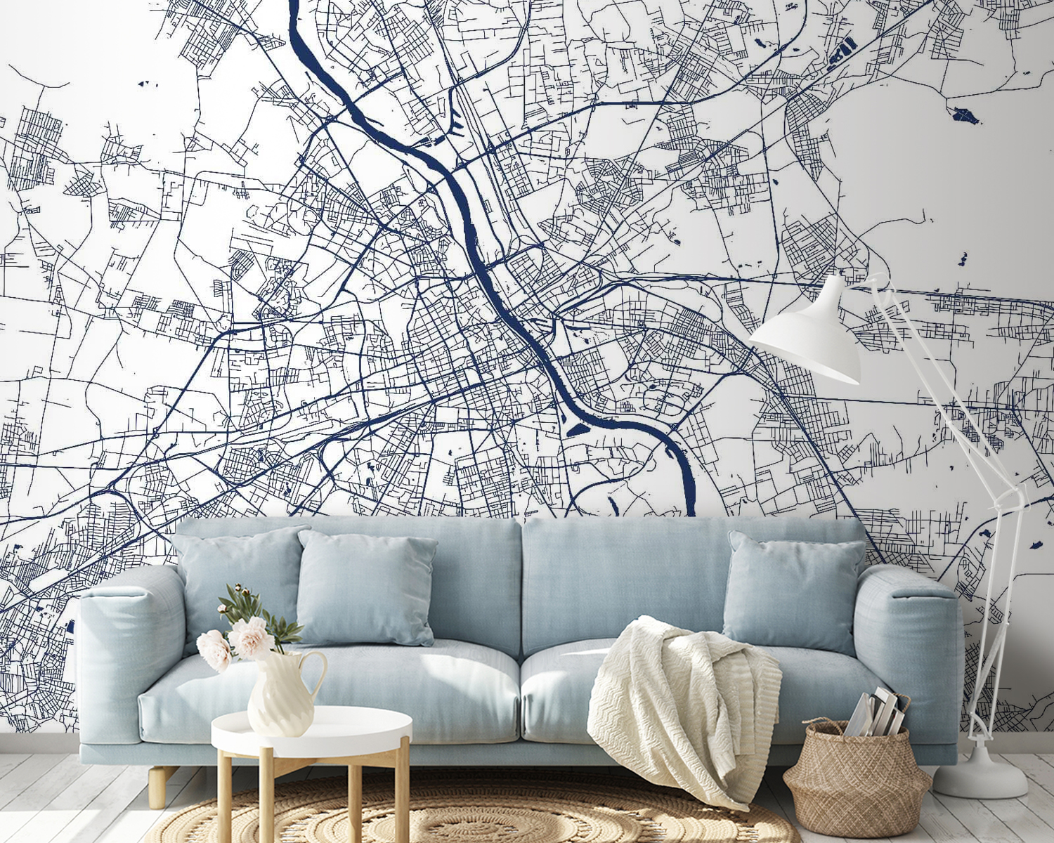 Einen Raum in etwas Besonderes zu verwandeln, ist so einfach wie das Anbringen dieser Wandtapete mit einem Stadtplan. Es ist wie ein Portal zum Abenteuer direkt in Ihrem Wohnzimmer. Stellen Sie sich die Geschichten vor, die sich entfalten könnten, wenn Freunde zusammenkommen und ihre Finger entlang der gewundenen Straßen und mäandernden Flüsse führen. Jeder kleine Abschnitt könnte eine Erinnerung wecken – vielleicht ein Lieblingscafé oder einen versteckten Park. Die kühnen marineblauen Linien vor einem klaren Hintergrund verleihen dem Ganzen einen Hauch von Raffinesse, ohne dabei an Gemütlichkeit einzubüßen. Ihre Wände sind nicht mehr nur Wände, sondern bieten unendliche Möglichkeiten und einen Hauch von Nostalgie. Lassen Sie sich von dieser Fototapete zum Träumen oder zur Planung des nächsten Ausflugs inspirieren.