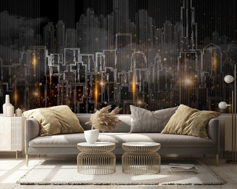 Verwandeln Sie jeden Raum in eine belebte Stadtlandschaft mit dieser fesselnden Fototapete. Stellen Sie sich vor, Sie blicken auf eine lebendige Skyline, in der abstrakte Formen mit warmen Lichtern tanzen und eine gemütliche und doch lebendige Atmosphäre verbreiten. Perfekt für die Ecke, die etwas Charakter braucht, oder für das Büro zu Hause, das sich nach ein wenig Inspiration sehnt. Stellen Sie sich einen Freund vor, der vorbeikommt, einen Kaffee trinkt und zustimmend nickt, wenn er Ihre stilvolle Wahl sieht. Das Wandbild bringt einen Hauch von städtischem Charme mit sich, der Sie fast den Herzschlag der Stadt spüren lässt. Es ist, als hätten Sie eine Mini-Metropole in Ihrem Raum – Staus nicht inbegriffen.