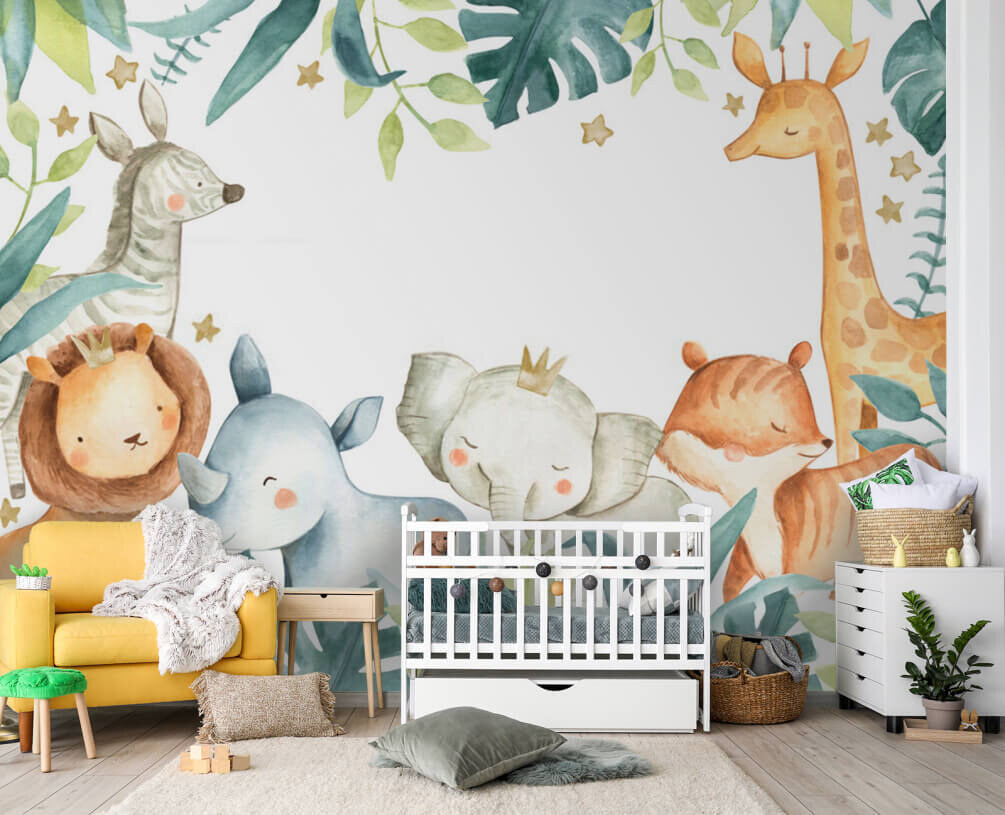 Möchten Sie das Zimmer Ihres Kindes verschönern? Dann ist dieses bezaubernde Wandbild “Aquarell eines Elefanten und eines Fuchses” ein absolutes Must-Have! Stellen Sie sich weiche, verträumte Aquarelltöne vor, die eine bezaubernde Szene direkt an die Wand malen – perfekt für ein Kinderzimmer oder ein Kinderzimmer! Die niedlichen und freundlichen Tiere, wie ein Elefant mit einer winzigen Krone und ein süßer, schlummernder Fuchs, zaubern mit Sicherheit ein Lächeln auf die Lippen. Der Rahmen aus Blättern und die skurrilen Sterne verleihen dem Ganzen noch einen Hauch von Magie. Stellen Sie sich die Freude Ihres Kindes vor, wenn es in diese zauberhafte, märchenhafte Welt eingewickelt wird. Das ist nicht nur Dekoration – es ist eine tägliche Dosis Freude! Und wer kann schon einem gezähmten Safari-Abenteuer für seinen kleinen Entdecker widerstehen?