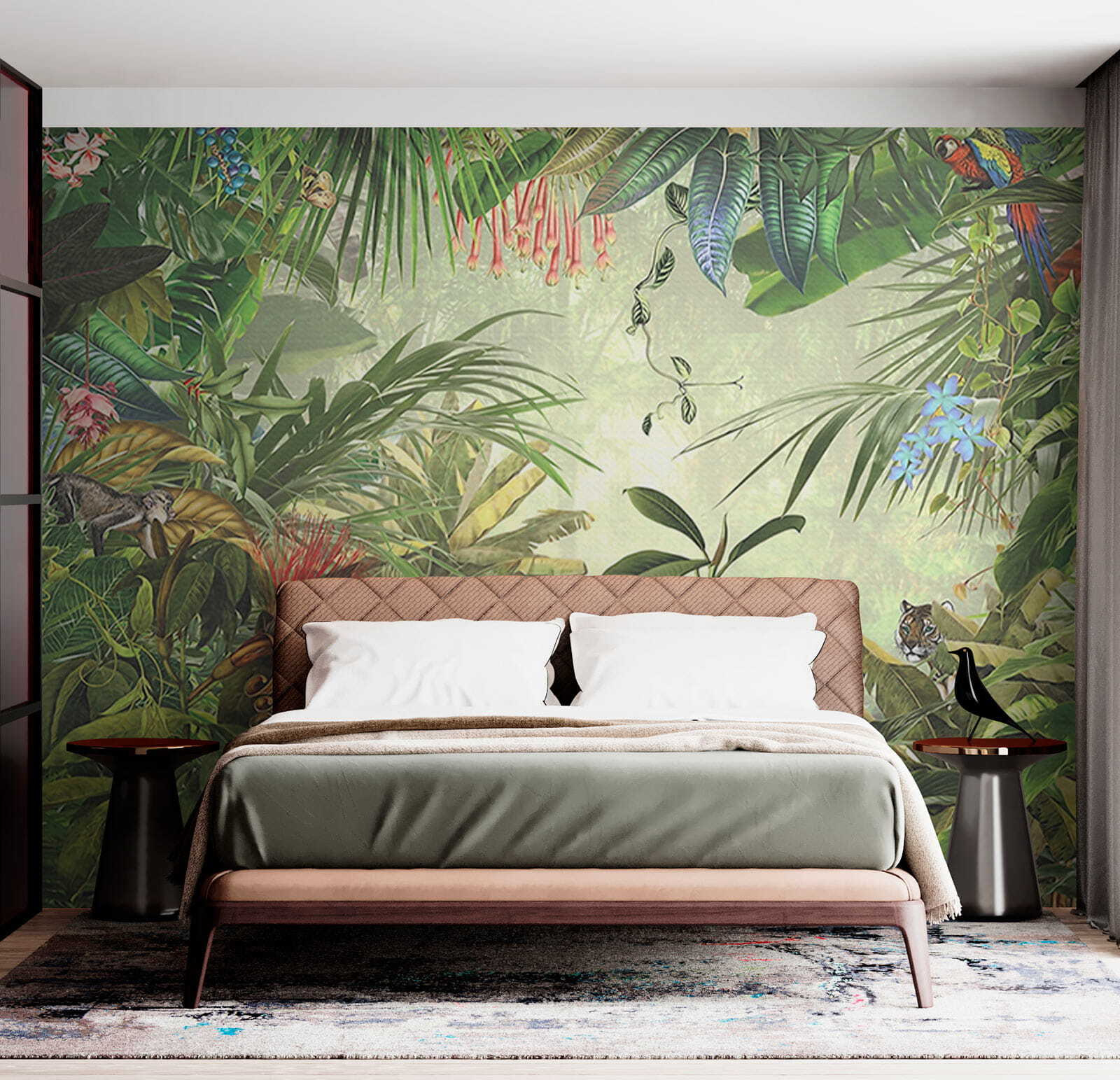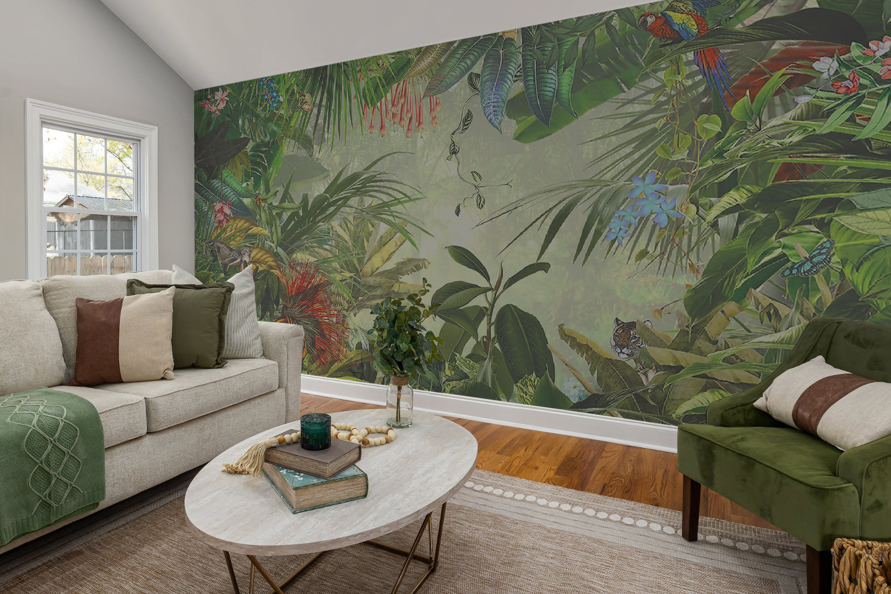 Wollten Sie schon immer, dass sich Ihr Wohnbereich wie ein exotisches Abenteuer anfühlt? Diese Fototapete “Lush Jungle” könnte genau das Richtige sein. Stell dir vor, du wachst auf, trinkst deinen Kaffee und starrst direkt in einen pulsierenden Regenwald, der vor Leben strotzt – Papageien, Affen, Tiger… Man könnte fast das Rascheln der Blätter hören oder eine kühle Dschungelbrise spüren! Die Farben sind einfach herrlich satt – satte Grüntöne, satte Erdtöne, blumige Akzente. Perfekt für Naturliebhaber oder alle, die sich nach einem Hauch von Wildnis zu Hause sehnen. Es ist wie eine kleine Flucht, direkt an deiner Wand!🌿🦜