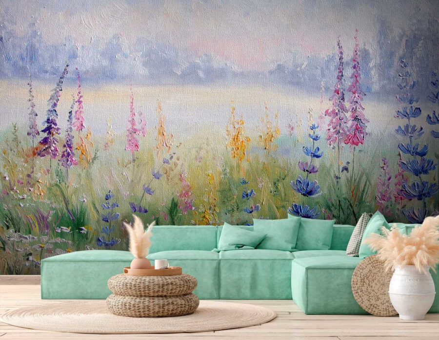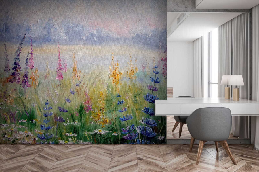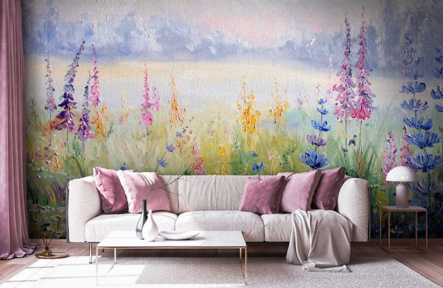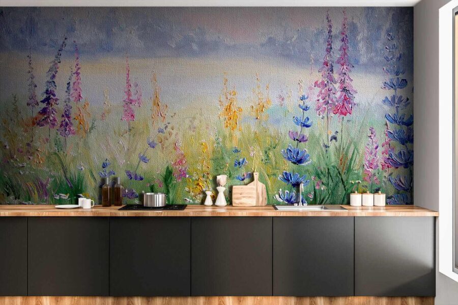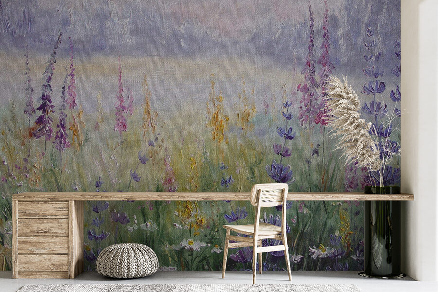 Bringen Sie mit der Fototapete “Lavendelblüten in buntem Feld” einen Hauch von Charme und Gelassenheit in Ihren Raum. Stellen Sie sich vor, Sie betreten ein Feld voller zarter Aquarellblüten – eine reizvolle Mischung aus Lila, Gelb und Rosa, die in der Brise tanzen. Dieses Wandbild ist nicht nur ein Kunstwerk, sondern ein Erlebnis – ein friedlicher Moment, eingefroren in der Zeit.