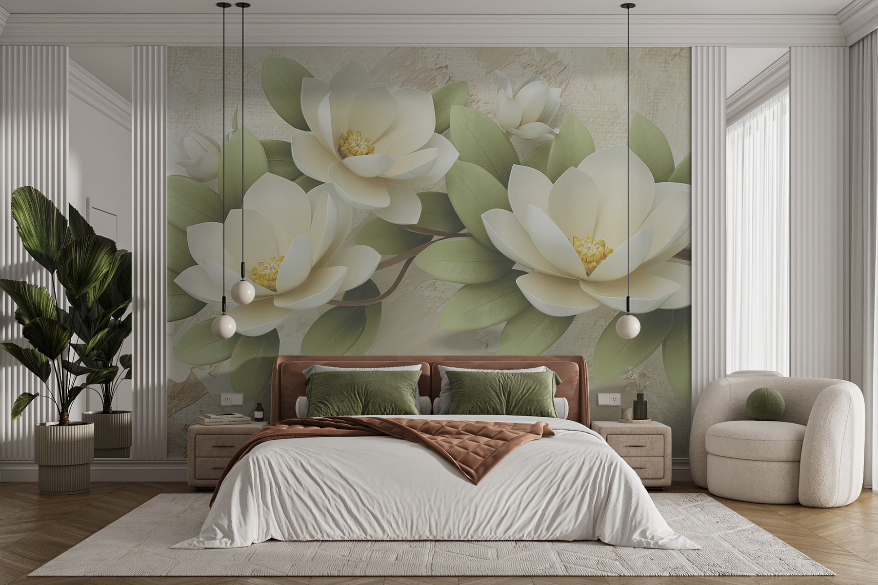 Wow, sieh dir nur diese Blumen an! Die Fototapete “Elegante Blumen mit grünen Blättern” ist wie ein Stück Gelassenheit direkt in Ihrem Zimmer. Stellen Sie sich vor, Sie wachen jeden Morgen mit diesen großen, cremefarbenen Blüten auf – einfach erfrischend, oder? Es ist, als ob man sich den Charme eines Frühlingsgartens ins Haus holt, ohne dass man sich um die Pflege kümmern muss. Perfekt für alle, die einen Hauch von Natur lieben, aber nicht gerade einen grünen Daumen haben.