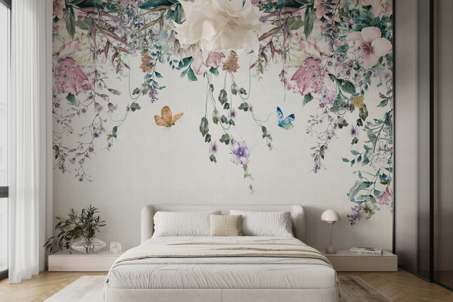 Dieses Wandbild ist nicht nur eine Dekoration, sondern auch eine Stimmung. Stellen Sie sich vor, Sie entspannen sich nach einem langen Tag, umgeben von Blüten und schwebenden Schmetterlingen… friedlich, oder? Es ist, als hätten Sie Ihr persönliches Stückchen vom Paradies. Warum also warten? Lassen Sie Ihre Wände eine Geschichte von Eleganz und lebendigem Charme erzählen!