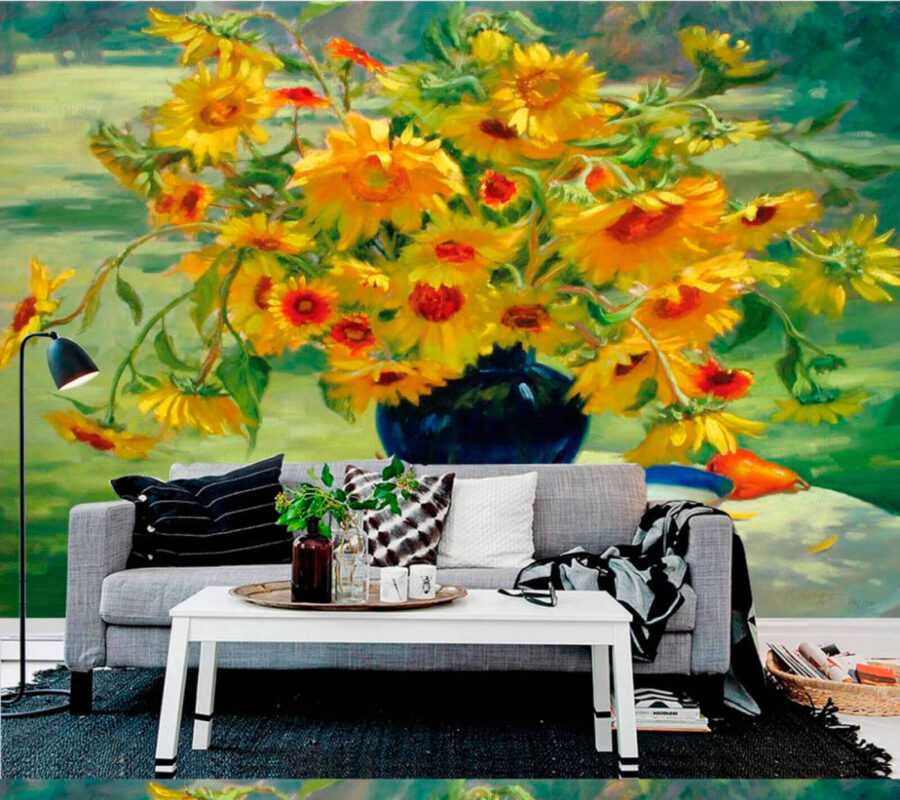 Verwandeln Sie jeden Raum in eine fröhliche Oase mit dieser atemberaubenden Fototapete mit einer Vase voller gelber Blumen und leuchtender Früchte. Stellen Sie sich vor, Sie wachen mit dieser sonnigen Szene auf – es ist wie ein kleines Stück Natur direkt in Ihrem Zuhause. Es ist perfekt, um einen Farbtupfer in die Küche zu bringen oder ein gemütliches Wohnzimmer zu verschönern. Durch die lebendigen Details wirkt es fast dreidimensional, zieht das Auge an und macht es leicht, sich in der Schönheit zu verlieren. Außerdem ist es ein toller Gesprächsanlass. Wer würde nicht gerne über die große Freude plaudern, die diese fröhlichen Blüten bereiten? Ein Hauch von Charme, ein Hauch von Laune – dieses Wandbild wird die Stimmung heben und ein Lächeln hervorrufen.