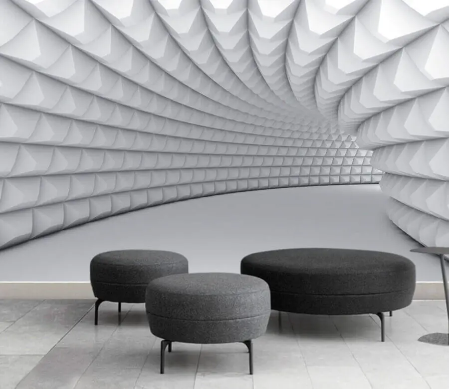 Treten Sie ein in eine faszinierende Welt mit dieser futuristischen, geometrischen Tunnelwandmalerei. Stellen Sie sich vor, Sie verwandeln eine schlichte Wand in eine immersive Reise, bei der jeder Blick wie ein Eintauchen in eine Welle aus scharfen Winkeln und sanften Kurven wirkt. Es ist, als würde man sich in einem Traum verlieren, in dem alles eine Form und einen Zweck hat. Perfekt für eine Lounge oder einen kreativen Raum, regt dieses Design zu Gesprächen an und inspiriert. Stellen Sie sich vor, wie Ihre Freunde es bewundern, während Sie an einem Kaffee nippen oder einfach nur von anderen Welten träumen. Es verleiht ihm mühelos Tiefe und eine spielerische Ausstrahlung, die jeden dazu einlädt, es sich genauer anzusehen und vielleicht das eine oder andere Selfie zu machen!