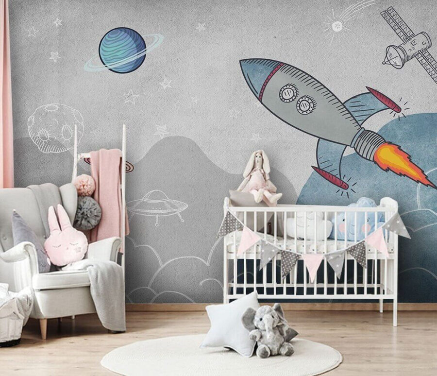 Haben Sie schon einmal davon geträumt, das Zimmer eines Kindes in ein skurriles Weltraumabenteuer zu verwandeln? Stellen Sie sich das vor: eine Wandmalerei mit einem Raketenschiff, das zwischen verspielten Planeten und gezeichneten fernen Galaxien abhebt. Es ist wie eine Seite aus einem Märchenbuch!