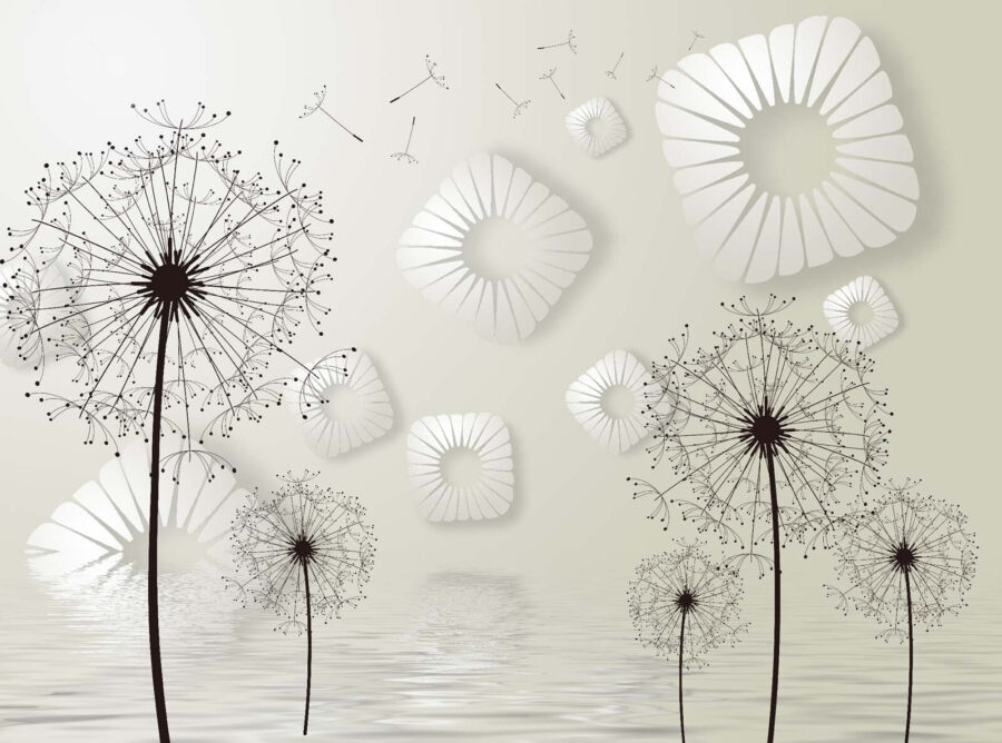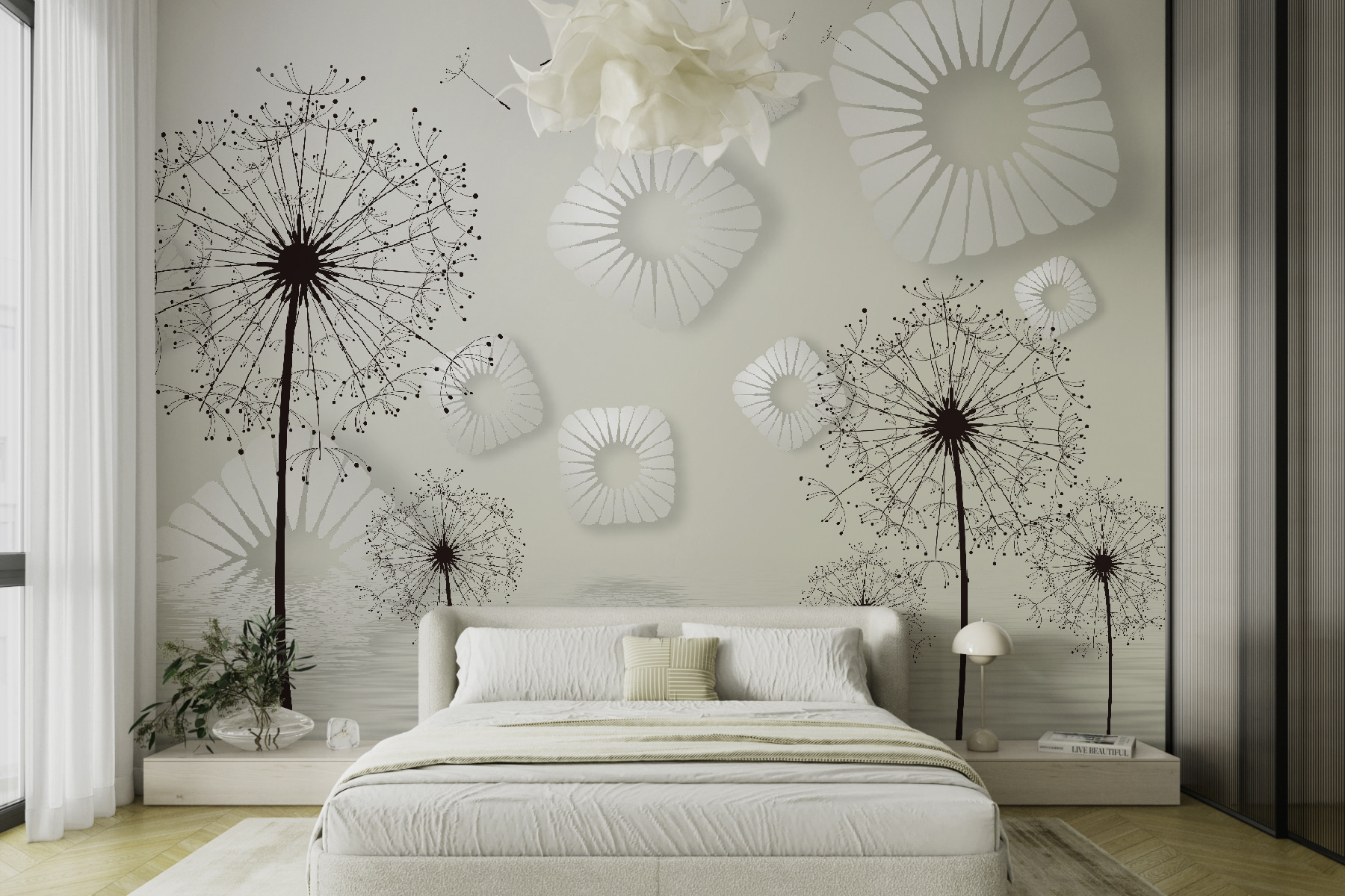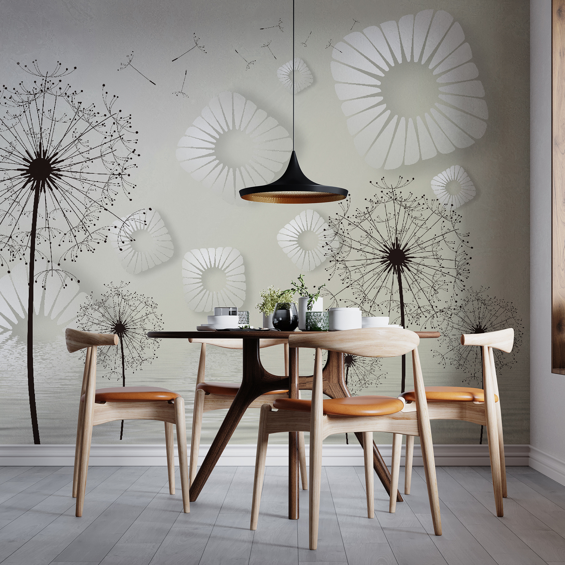 Die Verwandlung eines Raumes kann sich wie Magie anfühlen, und dieses Wandgemälde fängt diese Stimmung perfekt ein. Stellen Sie sich vor, Sie betreten einen Raum, der mit zarten Pusteblumen bemalt ist, deren bezaubernde, wispy Formen zu Tagträumen und Laune einladen. Die weißen, kreisförmigen Motive schweben wie Wolken und verleihen dem Raum eine leichte, luftige Note, die frisch und einladend wirkt.