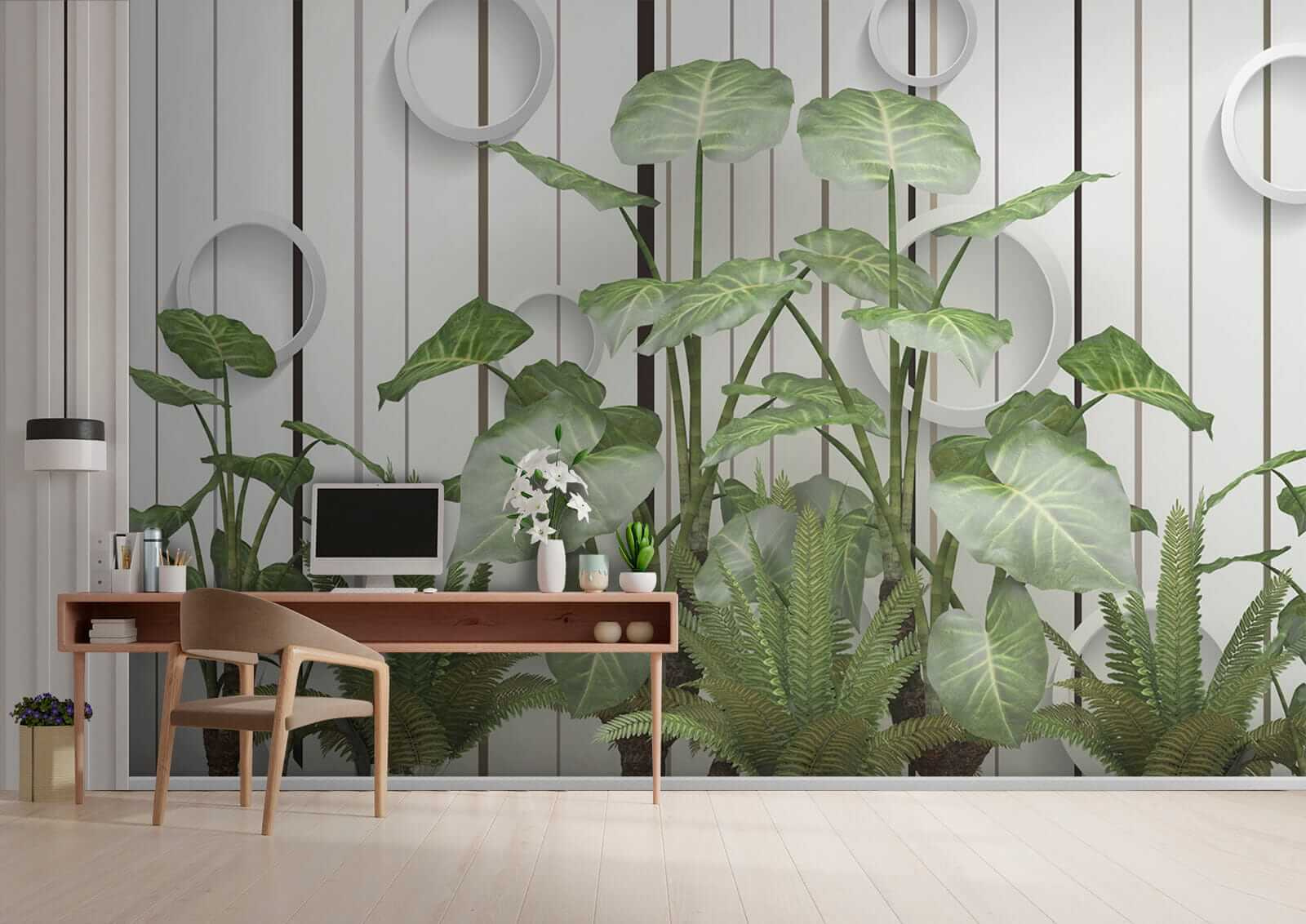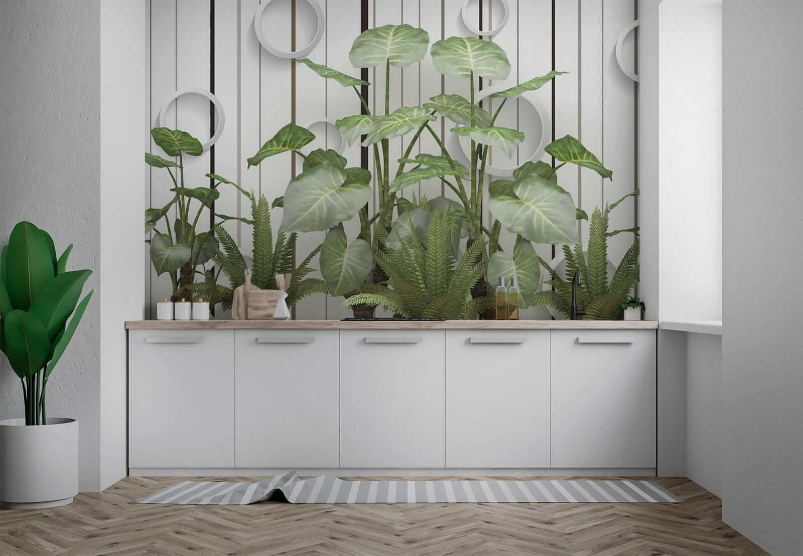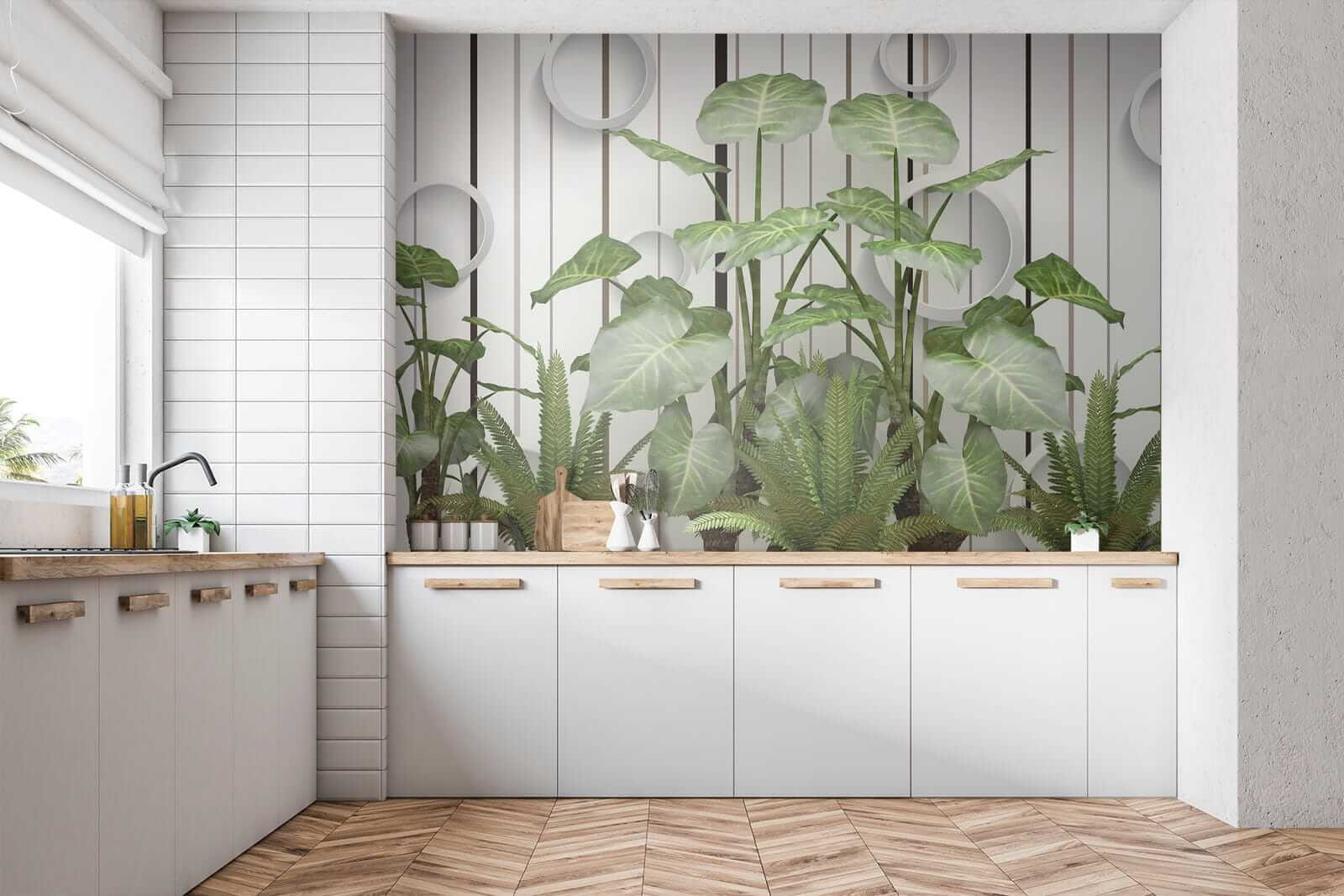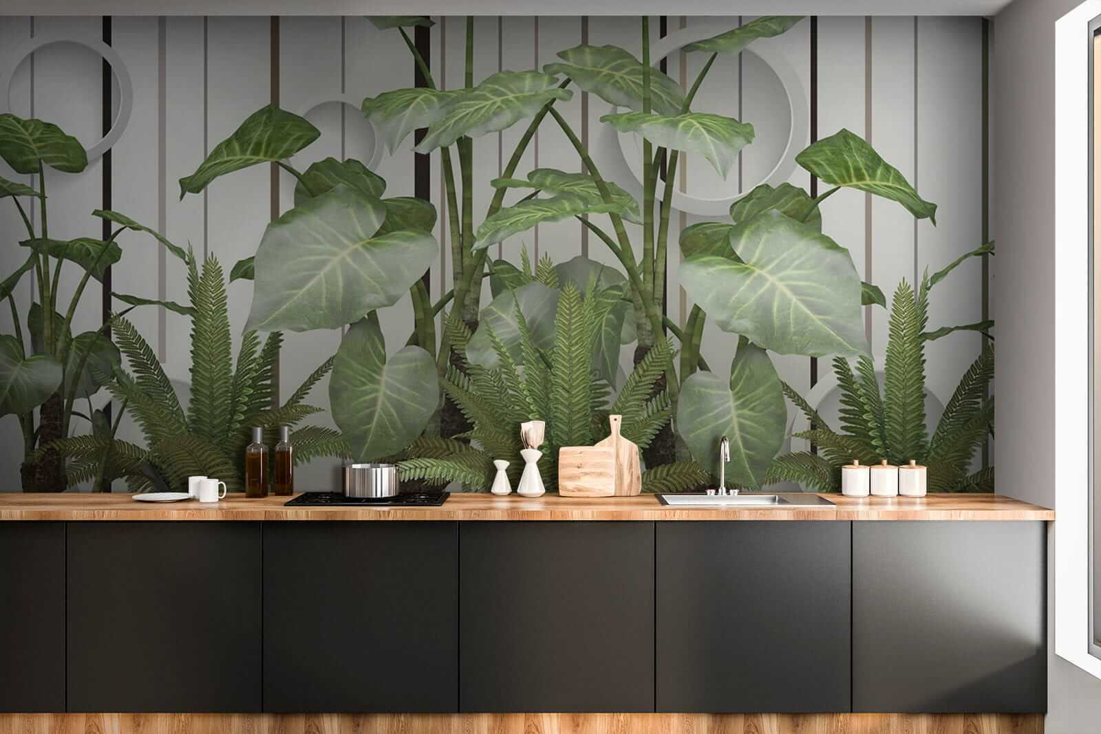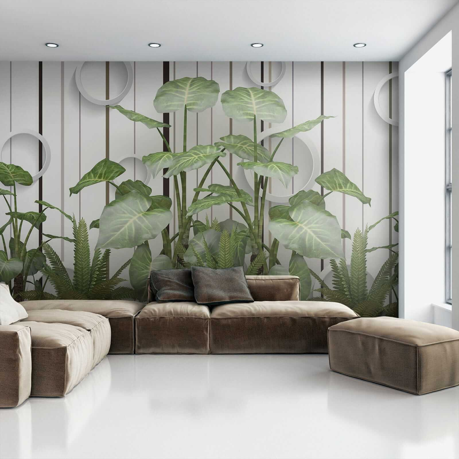 Stellen Sie sich das vor: Wände, die mit lebendigen, üppigen Blättern bedeckt sind, die sich von den glatten Streifen abheben… im Ernst, es ist, als hätten Sie einen Hauch von Dschungel in Ihrem Wohnzimmer, ohne die Feuchtigkeit! Diese Fototapete “Üppige Blätter vor einer gestreiften Wand” verbindet mühelos die beruhigende Essenz der Natur mit einem modernen Touch. Egal, ob Sie ein Pflanzenliebhaber mit einem schwarzen Daumen sind oder sich einfach nur nach einem Hauch von Natur sehnen, diese Fototapete ist genau das Richtige für Sie – ganz ohne Gießen. Stellen Sie sich vor, Sie sitzen auf Ihrer Couch und spüren diese frische, grüne Atmosphäre… sie erweckt den ganzen Raum zum Leben! Außerdem sorgen die coolen runden Akzente für ein schrulliges 3D-Flair – ein echter Hingucker. Es ist perfekt, um jedem Raum ein bisschen Charme und Gelassenheit zu verleihen. Es ist nicht nur eine Wandmalerei, sondern ein Gesprächsanlass, ein Stimmungsaufheller, ein kleines Stückchen grünes Paradies. 🌿