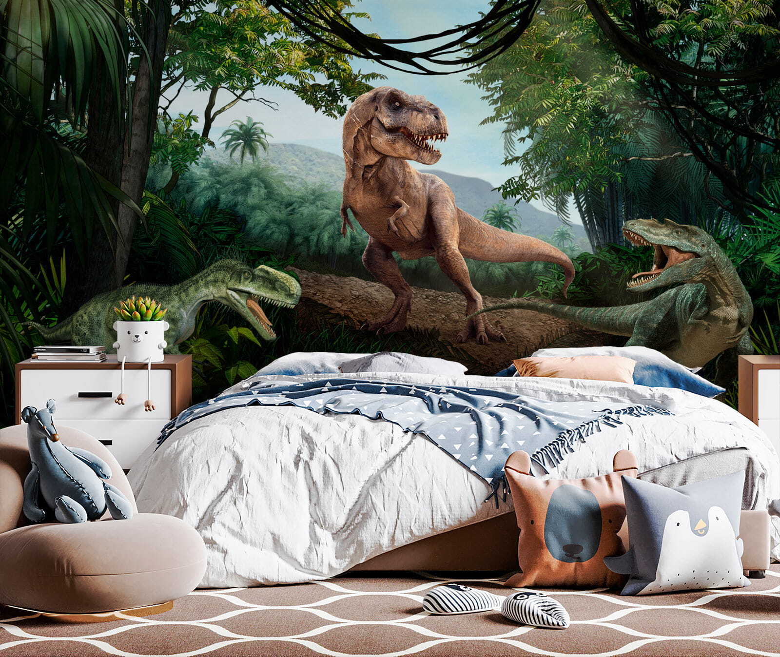 Ist Ihr Kind besessen von Dinosauriern? Oder vielleicht lieben Sie es einfach, langweilige Wände in atemberaubende Unterhaltungen zu verwandeln? Mit dieser lebendigen, naturgetreuen Fototapete können Sie in die Welt des Jura eintauchen – sie ist wie Ihre eigene Zeitmaschine! Stellen Sie sich vor, Sie wachen jeden Tag mit einem T-Rex auf (ohne den gruseligen Teil, natürlich). Perfekt für Kinderzimmer, Spielbereiche oder sogar das schrullige Heimbüro – ein sofortiger Stimmungsaufheller. Der 3D-Effekt sorgt für ein erstaunliches Gefühl der Tiefe, fast so, als könnten Sie direkt in den üppigen Dschungel eintauchen. Sind Sie bereit, etwas prähistorische Magie zu entfesseln? Rawr-some!