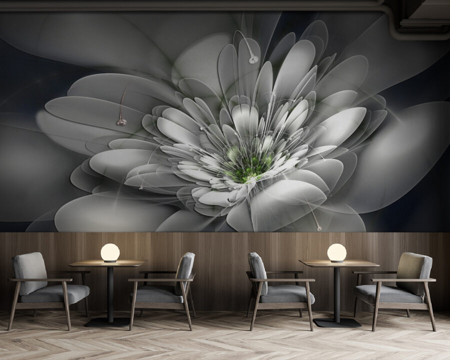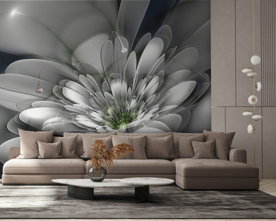 Stellen Sie sich vor, Sie betreten einen Raum, der sich sofort heller anfühlt, wie ein Hauch von frischer Luft. Diese Fototapete mit einer auffälligen weißen Blume mit einem leuchtend grünen Zentrum ist genau das Richtige. Die sanften Farbtöne und die anmutigen Kurven vermitteln ein Gefühl von Ruhe und Gelassenheit – perfekt für eine gemütliche Ecke oder einen lebendigen Wohnbereich.