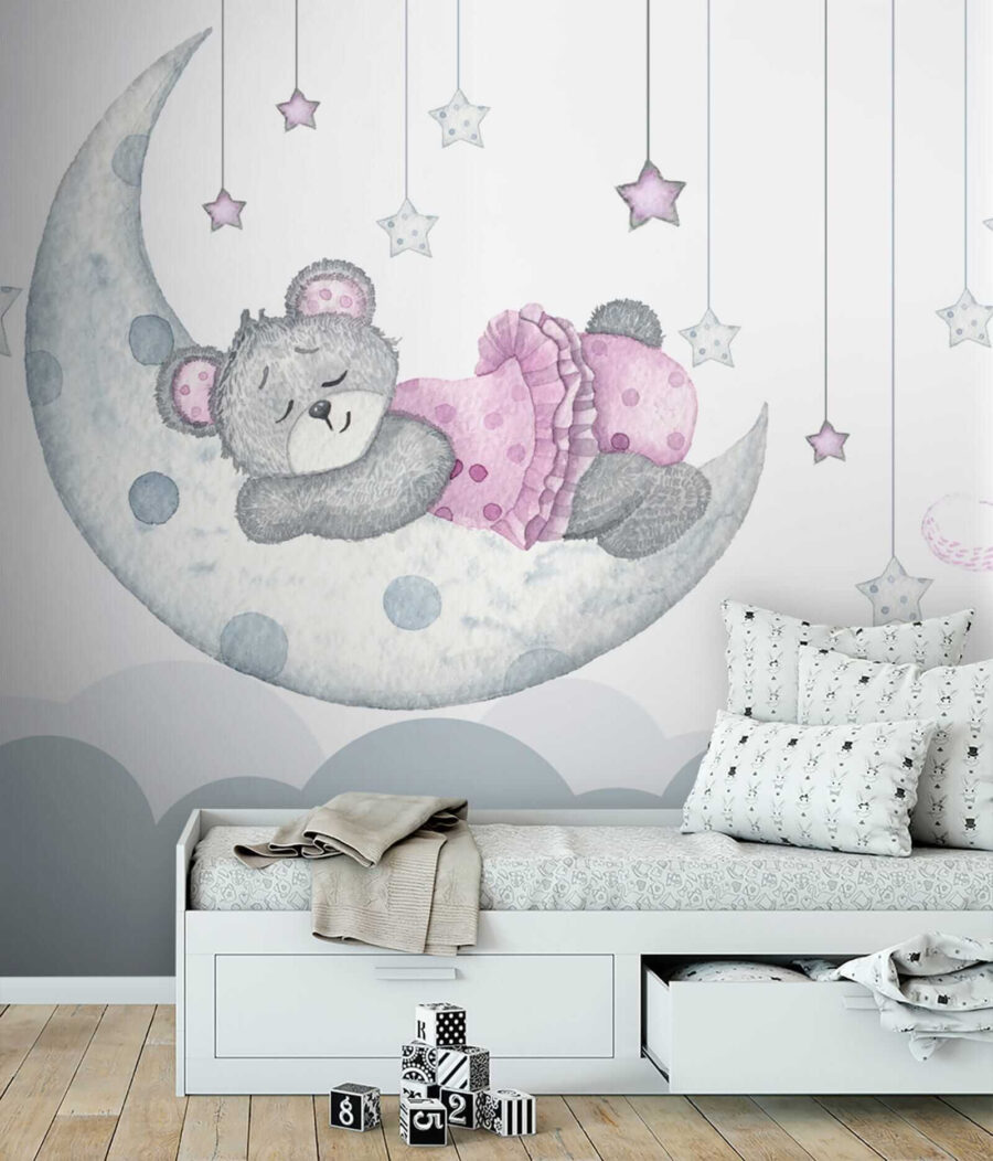 Stellen Sie sich einen Teddybären in einem rosa Kleid vor, der friedlich auf dem Mond schläft – klingt traumhaft, oder? Diese Aquarellwandmalerei ist perfekt, um jedem Kinderzimmer einen Hauch von Magie zu verleihen. Es ist weich und skurril, mit sanften Pastellfarben, die eine beruhigende Atmosphäre schaffen… perfekt für Gute-Nacht-Geschichten und süße Träume! Stellen Sie sich den Gesichtsausdruck Ihrer Kleinen vor, wenn sie ihren neuen besten Freund an der Wand sehen. Außerdem ist es eine tolle Kulisse für lustige Fotos. Gemütliche Stimmung und kreative Funken – dieses Wandbild bringt beides mit sich!