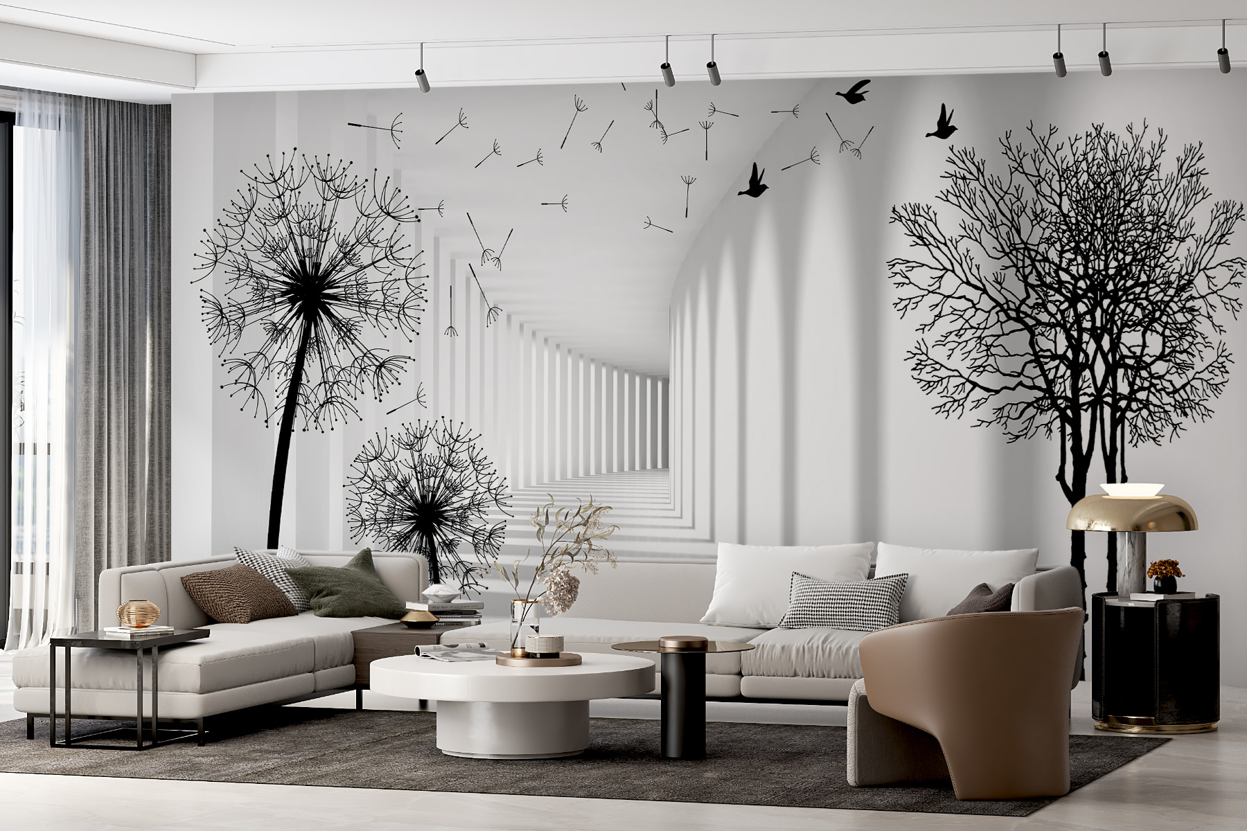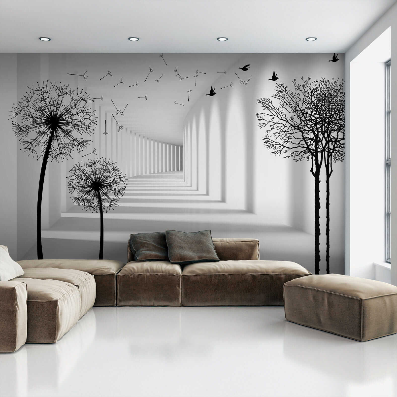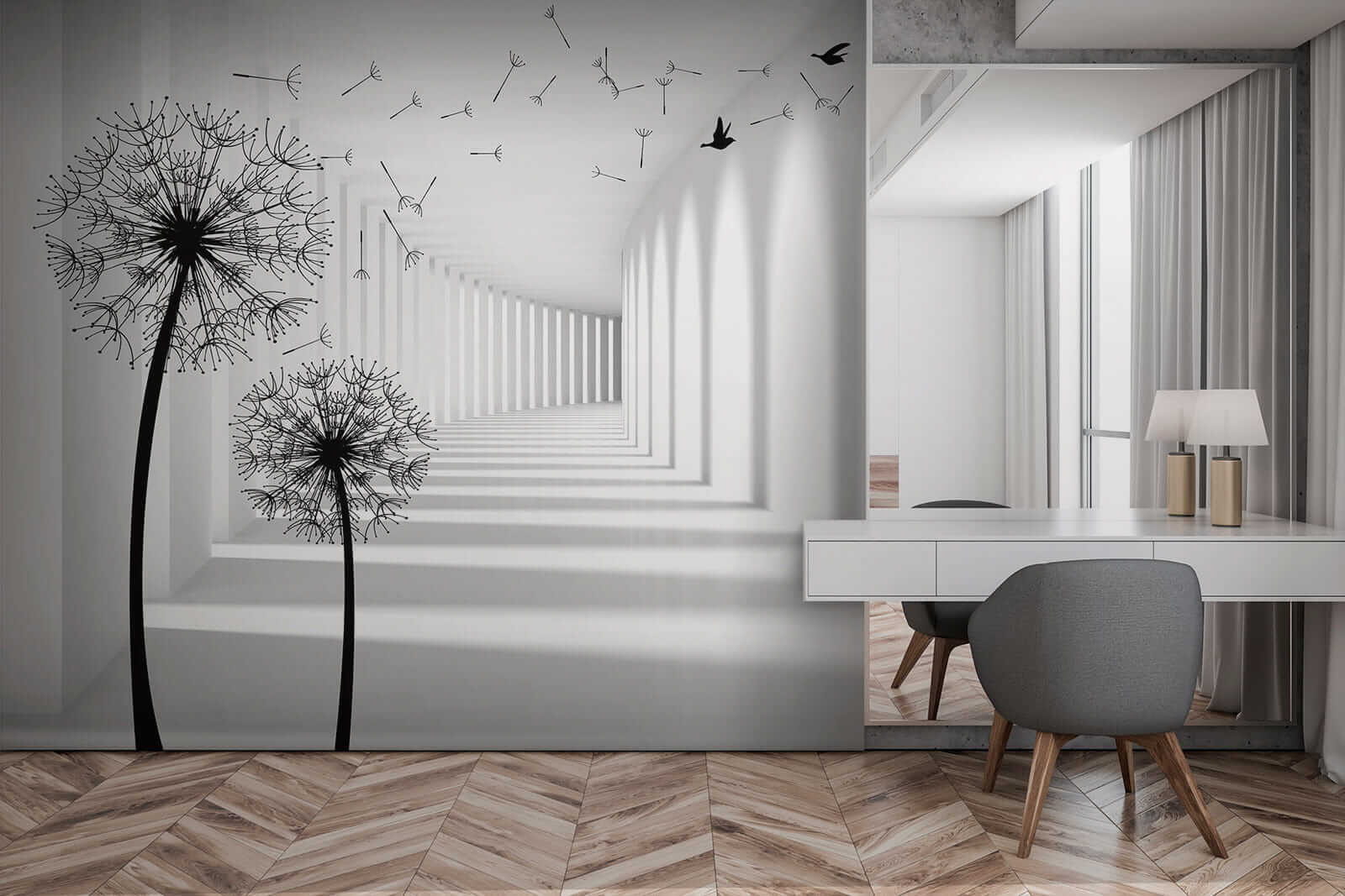 Stellen Sie sich vor, Sie betreten einen Raum und werden von dem fröhlichen Tanz der Pusteblumen begrüßt! Diese Fototapete mit dem Titel “Black Silhouette of a Dandelion” (Schwarze Silhouette einer Pusteblume) macht genau das – es ist, als würde man einen sanften, luftigen Tag in einem Raum einfangen. Die markanten schwarzen Silhouetten vor einem hellen Hintergrund bilden einen atemberaubenden Kontrast. Das Tolle daran ist, dass es den Raum zu dehnen scheint und jeden Raum größer und offener erscheinen lässt. Außerdem haben diese schwebenden Samen etwas sehr Beruhigendes, nicht wahr? Es ist fast so, als ob man eine sanfte Brise spüren kann, die durch den Raum weht.