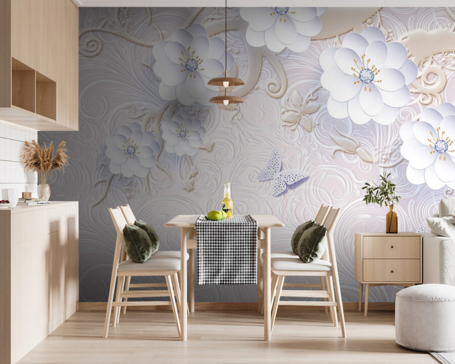 Verwandeln Sie Ihren Raum in eine Oase der Ruhe mit dieser atemberaubenden Wandtapete mit zarten weißen Blumen und flatternden Schmetterlingen. Sie ist wie ein Hauch frischer Luft – perfekt, um eine gemütliche Ecke aufzuhellen oder eine traumhafte Kulisse im Schlafzimmer zu schaffen. Stellen Sie sich vor, Sie trinken Ihren Morgenkaffee, genießen die beruhigende Atmosphäre oder träumen sogar von einem Garten in voller Blüte. Die sanften Farben und filigranen Muster geben Ihnen vielleicht das Gefühl, durch einen geheimen Blumengarten zu schlendern. Und wer würde nicht gerne Schmetterlinge an seinen Wänden tanzen sehen? Diese Tapete verleiht Ihrem Zuhause einen Hauch von Verspieltheit und bleibt dabei stilvoll – perfekt für alle, die ein bisschen Natur in ihre vier Wände holen möchten.