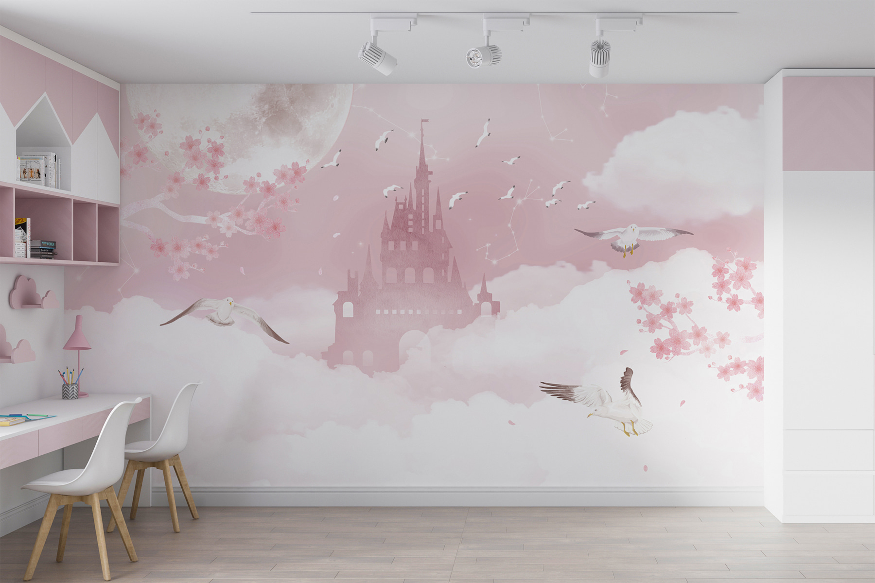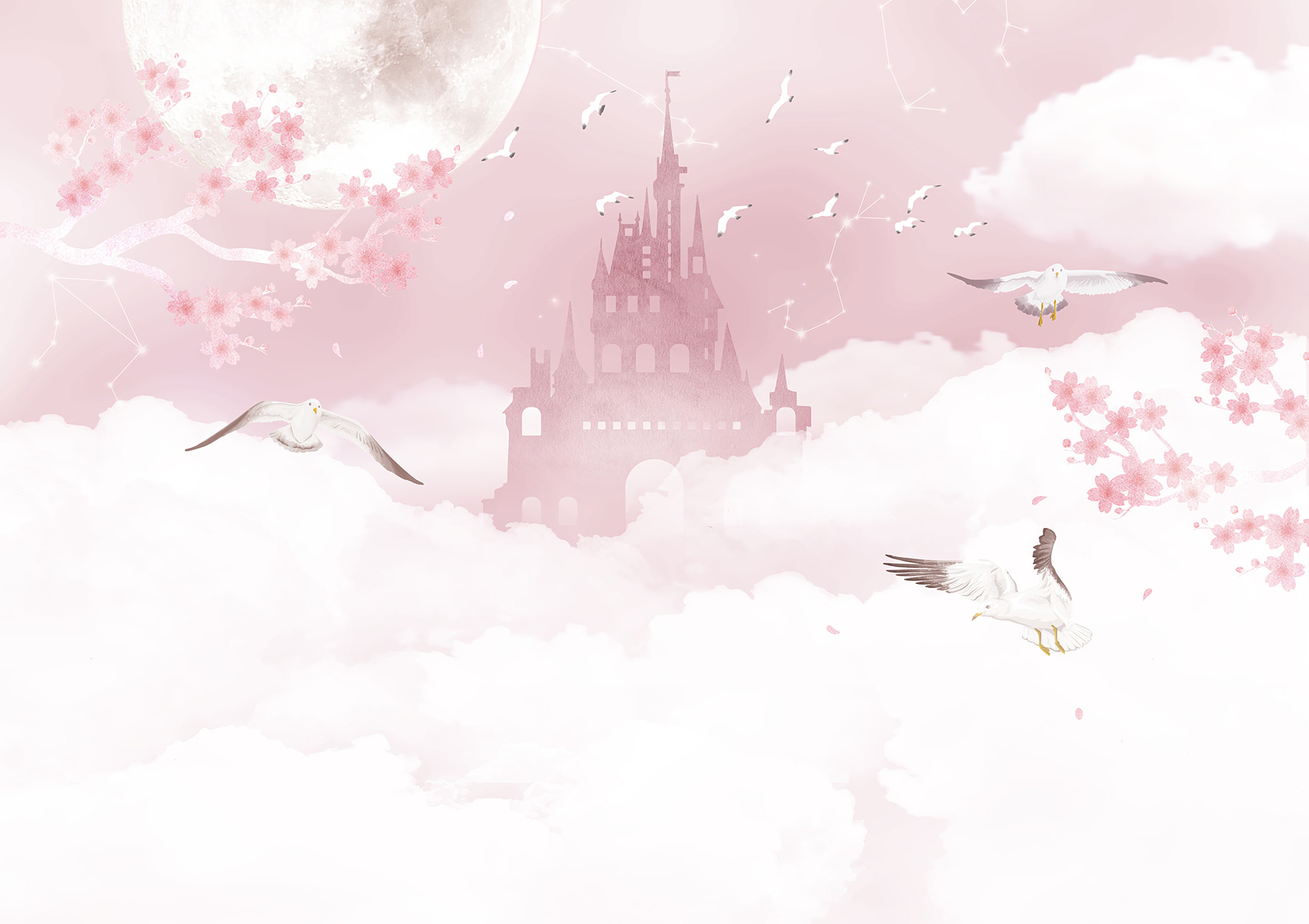 Schauen Sie sich dieses verträumte “Fototapeten White Bird Flying in the Sky” an – es ist, als würde man in eine skurrile Fantasie eintauchen! Perfekt für Kinderzimmer, besonders wenn Ihr Kind Märchen und zauberhafte Szenen liebt. Stellen Sie sich das vor: weiche, flauschige Wolken, Vögel, die in die Freiheit fliegen, ein magisches Schloss im Hintergrund und zarte Kirschblüten… Es ist wie eine lebendig gewordene Gutenachtgeschichte.