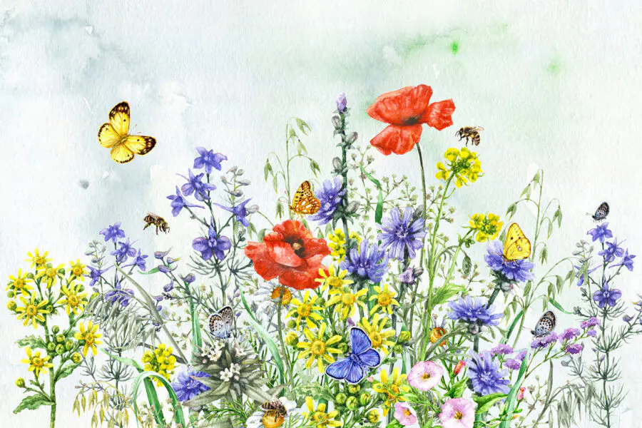 Stellen Sie sich vor, Ihr Zimmer erstrahlt in der fröhlichen Stimmung eines Frühlingsgartens, direkt an Ihrer Wand! Das ist es, was “Fototapeten Vibrant blossoms and fluttering butterflies” zu bieten hat. Diese Fototapete verbindet mühelos die üppige Schönheit von Wildblumen mit anmutigen Schmetterlingen, die in der Luft tanzen. Als ob man einen perfekten Sonnentag einfangen würde!