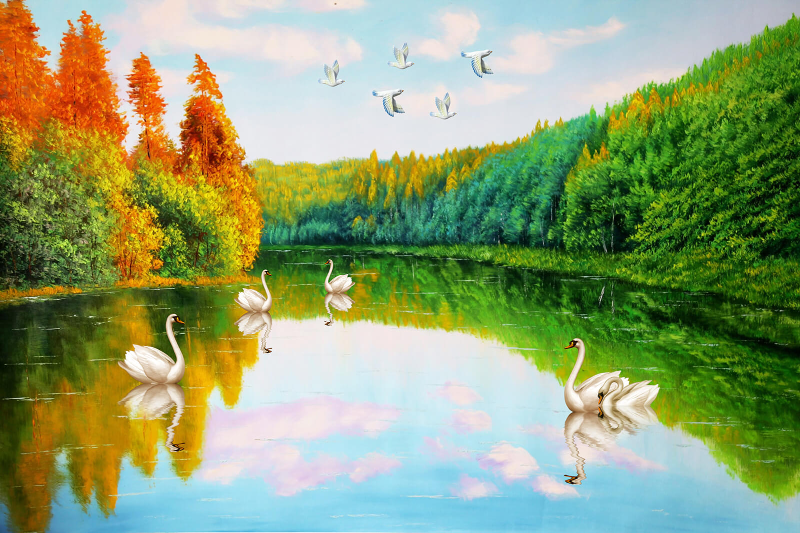 Verwandeln Sie jeden Raum in eine Oase der Ruhe mit dieser bezaubernden Wandtapete, auf der anmutige Schwäne über einen ruhigen See gleiten. Das reizvolle Zusammenspiel von leuchtendem Grün und warmen Herbsttönen schafft eine atemberaubende Kulisse, die zum Träumen von entspannten Nachmittagen am Wasser einlädt. Stellen Sie sich vor, Sie trinken Tee und versinken in Gedanken, während diese eleganten Vögel vorbeischweben. Es ist, als würde man ein Stück Natur ins Haus holen – ohne die Mücken! Diese Tapete eignet sich perfekt für Wohnzimmer oder gemütliche Ecken und strahlt Ruhe und Charme aus, wodurch sie eine sanfte Gelassenheit in den Alltag bringt. Und wer würde nicht gerne das Gefühl haben, in der Nähe eines versteckten See-Paradieses zu leben?