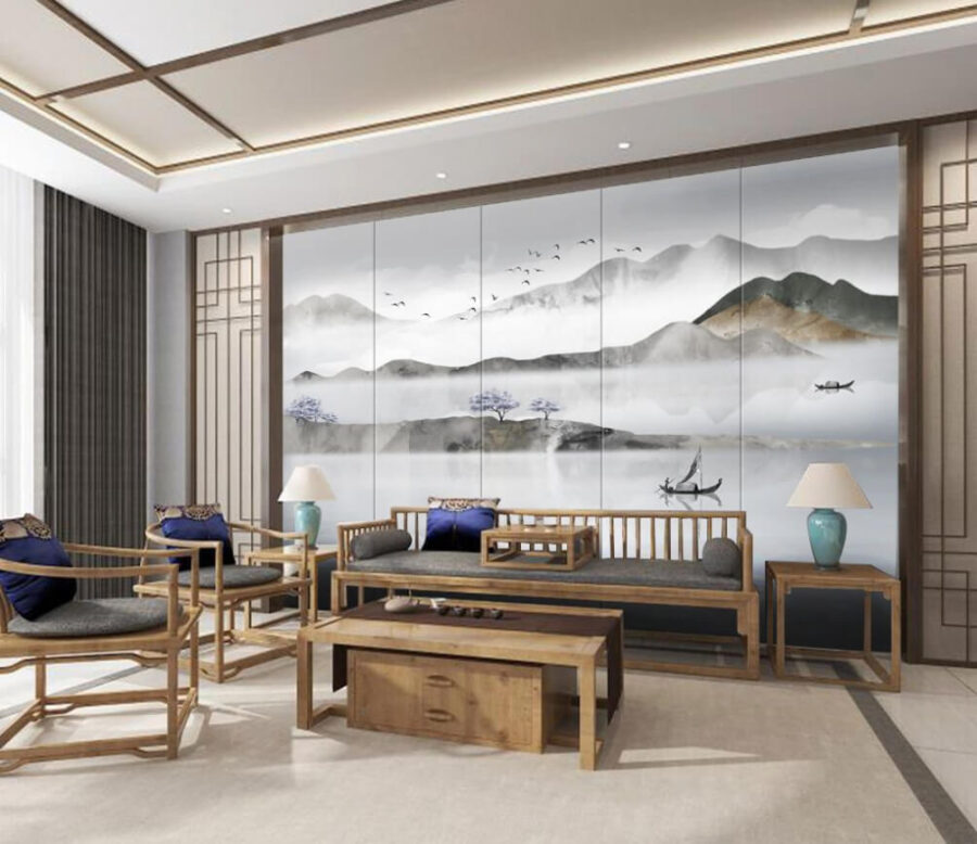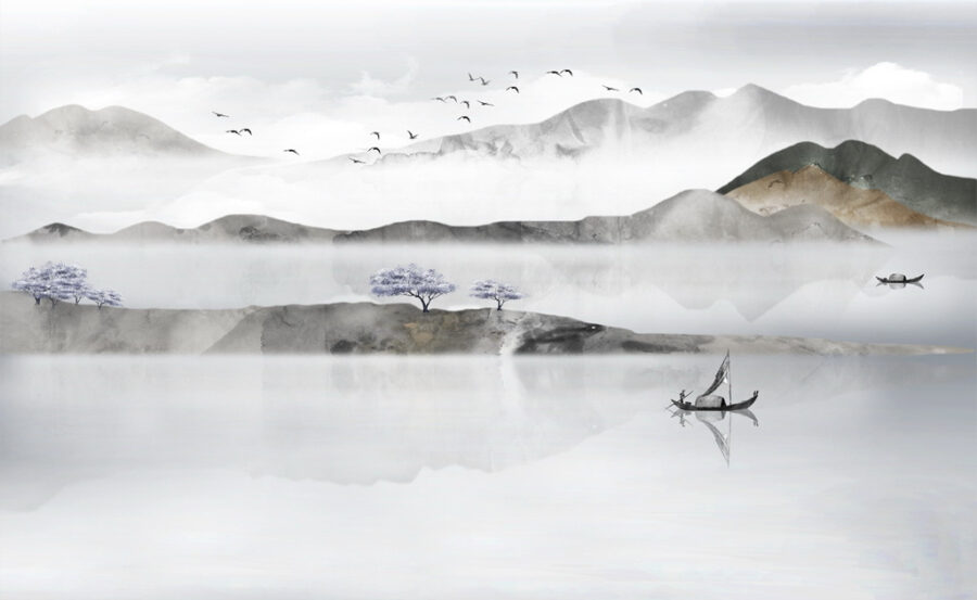 Hier ist ein Wandgemälde, das Ihnen das Gefühl gibt, in einer heiteren Traumwelt zu schweben. Stellen Sie sich vor, Sie nippen an Ihrem Morgenkaffee und blicken auf diese beruhigende Szene eines einsamen Bootes, das auf einem spiegelglatten See treibt, umgeben von nebligen Bergen. Ah, diese Ruhe… Man könnte glatt vergessen, dass man sich in seinem Wohnzimmer befindet! Es hat diese bezaubernde Zen-Atmosphäre, die einen in den Bann zieht – als ob die Berge und das Boot einem ihre Geheimnisse zuflüstern wollen. Perfekt für Leute, die sich nach ein wenig Ruhe oder künstlerischer Inspiration in ihrem Raum sehnen. Man kann fast das sanfte Rauschen der Bäume oder das sanfte Plätschern des Wassers spüren… Atmen Sie ein, entspannen Sie sich, verlieren Sie sich vielleicht sogar in Gedanken. Wer weiß? Plötzlich ist Ihr Zuhause nicht mehr nur ein Zuhause – es ist ein friedlicher Rückzugsort.